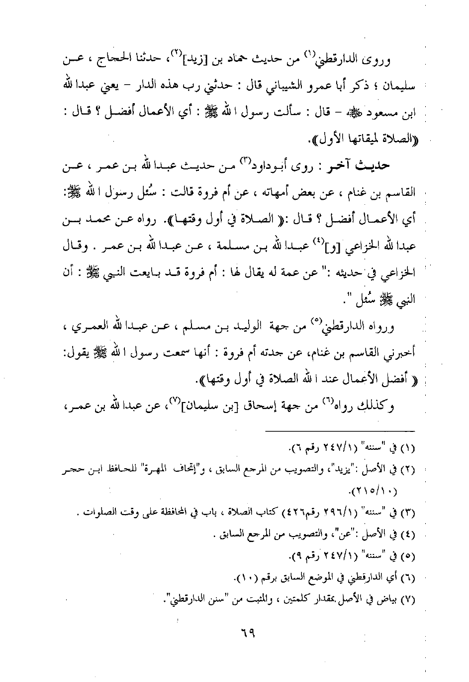 وروى الدارقطني من حديث حماد بن [زيد]، حدثنا الحجاج، عن سليمان، ذكر أبا عمرو الشيباني قال: حدثني رب هذه الدار – يعني عبد الله بن مسعود رضي الله عنه – قال: سألت رسول الله صلى الله عليه وسلم: أي الأعمال أفضل؟ قال: "الصلاة لميقاتها الأول".