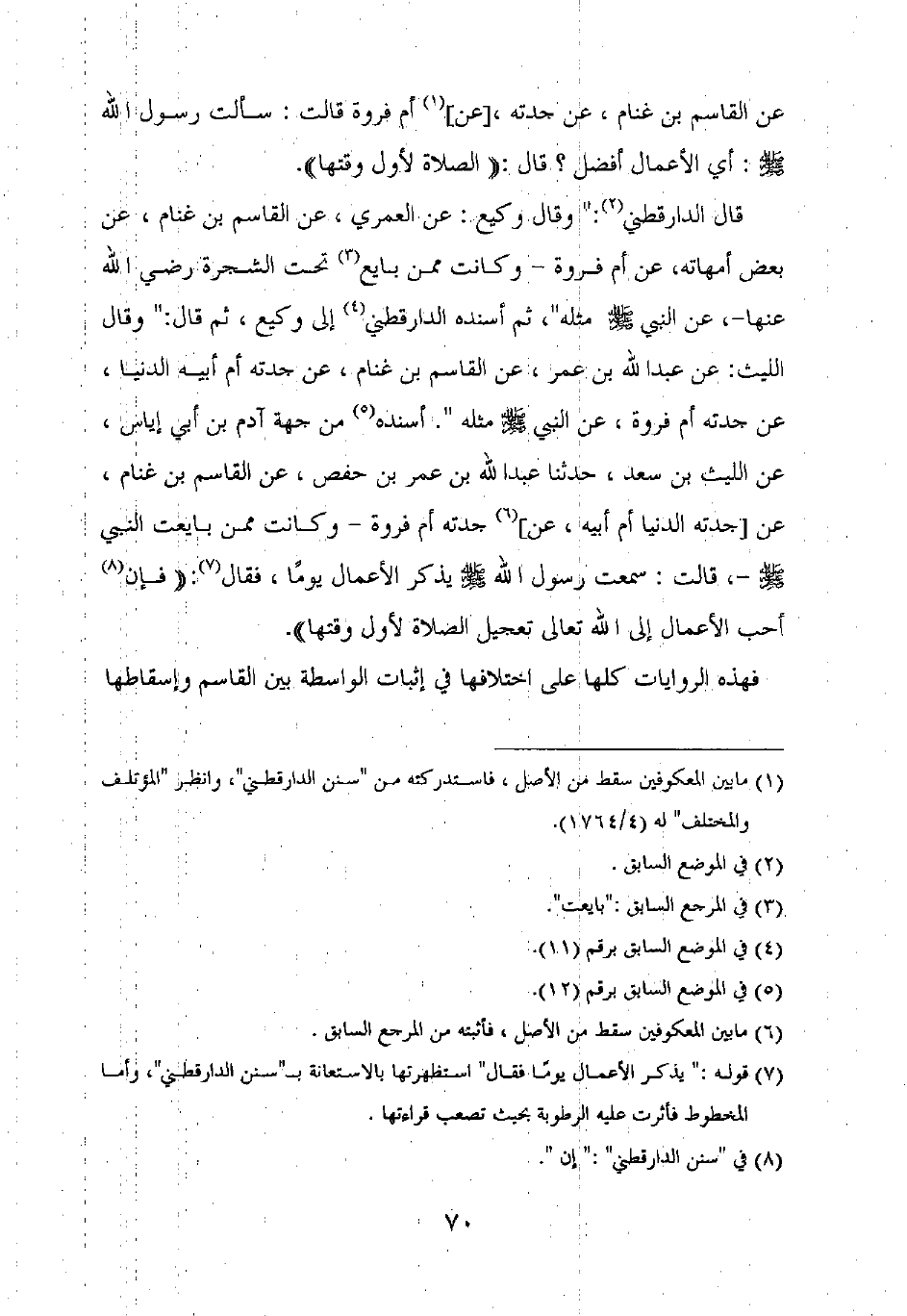 قال الدارقطني: "وقال وكيع: عن العمري، عن القاسم بن غنام، عن بعض أمهاته، عن أم فروة – وكانت ممن بايع تحت الشجرة رضي الله عنها –، عن النبي صلى الله عليه وسلم مثله"، ثم أسنده الدارقطني إلى وكيع، ثم قال: "وقال الليث: عن عبد الله بن عمر، عن القاسم بن غنام، عن جدته أم أبيه الدنيا، عن جدته أم فروة، عن النبي صلى الله عليه وسلم مثله". أسنده من جهة آدم بن أبي إياس، عن الليث بن سعد، حدثنا عبد الله بن عمر بن حفص، عن القاسم بن غنام، عن [جدته الدنيا أم أبيه، عن] جدته أم فروة – وكانت ممن بايعت النبي صلى الله عليه وسلم –، قالت: سمعت رسول الله صلى الله عليه وسلم يذكر الأعمال يوما، فقال: "فإن أحب الأعمال إلى الله تعالى تعجيل الصلاة لأول وقتها".
