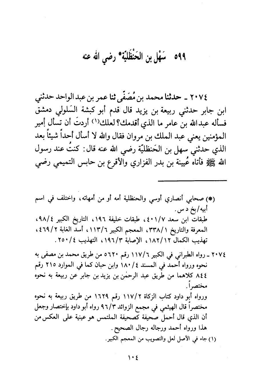 2074 - حَدَّثَنَا مُحَمَّدُ بْنُ مُصَفَّى، ثنا عُمَرُ بْنُ عَبْدِ الْوَاحِدِ، حَدَّثَنِي ابْنُ جَابِرٍ، حَدَّثَنِي رَبِيعَةُ بْنُ يَزِيدَ، قَالَ: " §قَدِمَ أَبُو كَبْشَةَ السَّلُولِيُّ دِمَشْقَ فَسَأَلَهُ عَبْدُ اللَّهِ بْنُ عَامِرٍ مَا الَّذِي أَقْدَمَكَ لَعَلَّكَ أَرَدْتَ أَنْ تَسْأَلَ أَمِيرَ الْمُؤْمِنِينَ يَعْنِي عَبْدَ الْمَلِكِ بْنَ مَرْوَانَ فَقَالَ: وَاللَّهِ لَا أَسْأَلُ أَحَدًا شَيْئًا بَعْدَ الَّذِي حَدَّثَنِي سَهْلُ بْنُ الْحَنْظَلِيَّةِ رَضِيَ اللَّهُ عَنْهُ قَالَ: كُنْتُ عِنْدَ رَسُولِ اللَّهِ صَلَّى اللهُ عَلَيْهِ وَسَلَّمَ فَأَتَاهُ عُيَيْنَةُ بْنُ بَدْرٍ الْفَزَارِيُّ، وَالْأَقْرَعُ بْنُ حَابِسٍ التَّمِيمِيُّ رَضِيَ اللَّهُ عَنْهُمَا فَسَأَلَا رَسُولَ اللَّهِ صَلَّى اللهُ عَلَيْهِ وَسَلَّمَ، فَدَعَا مُعَاوِيَةَ رَضِيَ اللَّهُ عَنْهُ فَأَمَرَهُ بِشَيْءٍ لَا أَدْرِي مَا هُوَ، فَأَقْبَلَ مُعَاوِيَةُ بِصَحِيفَتَيْنِ يَحْمِلَهُمَا فَأَلْقَى إِحْدَى الصَّحِيفَتَيْنِ إِلَى عُيَيْنَةَ وَكَانَ أَحْلَمَ الرِّجْلَيْنِ فَأَخَذَهَا فَرَبَطَها فِي عِمَامَتِهِ، وَأَلْقَى الْأُخْرَى إِلَى الْأَقْرَعِ بْنِ حَابِسٍ فَقَالَ: مَا فِيهَا؟ قَالَ: فِيهَا الَّذِي أُمِرْتَ بِهِ قَالَ: بِئْسَ وَافِدٍ لِقَوْمٍ إِذَا أَنَا جِئْتُهُمْ بِصَحِيفَةٍ أَحْمِلُهَا مَا أَدْرِي مَا فِيهَا كَصَحِيفَةِ الْمُلْتَمِسِ قَالَ: وَرَسُولُ اللَّهِ صَلَّى اللهُ عَلَيْهِ وَسَلَّمَ مُقْبِلٌ عَلَى رَجُلٍ يُحَدِّثُهُ فَلَمَّا سَمِعَ مَقَالَتَهُ أَخَذَ الصَّحِيفَةَ فَفَضَّها فَإِذَا فِيهَا الَّذِي أَمَرَ بِهِ قَالَ: فَأَلْقَاهَا وَقَامَ قَالَ: فَتَبِعْتُهُ حَتَّى مَرَّ عَلَى بَابِ الْمَسْجِدِ فَإِذَا بَعِيرٌ مُنَاخٌ فَقَالَ: «أَيْنَ صَاحِبُ هَذَا الْبَعِيرِ» فَابْتُغِيَ فَلَمْ يُوجَدْ فَقَالَ رَسُولُ اللَّهِ صَلَّى اللهُ عَلَيْهِ وَسَلَّمَ: «اتَّقُوا اللَّهَ عَزَّ وَجَلَّ فِي هَذِهِ الْبَهَائِمِ كُلُوهَا سِمَانًا وَارْكَبُوهَا صِحَاحًا» ثُمَّ مَضَى حَتَّى دَخَلَ مَنْزِلَهُ وَأَنَا مَعَهُ فَطَفِقَ يَقُولُ: «كَالْمُتَسَخِّطِ أَنَفًا إِنَّهُ مَنْ يَسْأَلُ النَّاسَ عَنْ ظَهْرِ غِنًى فَإِنَّمَا يَسْتَكْثِرُ مِنْ جَمْرِ جَهَنَّمَ» فَقُلْتُ: يَا رَسُولَ اللَّهِ وَمَا ظَهْرُ الْغِنَى؟ قَالَ: «أَنْ يَعْلَمَ أَنَّ عِنْدَ أَهْلِهِ مَا يُغَدِّيهِمْ أَوْ يُعَشِّيهِمْ»