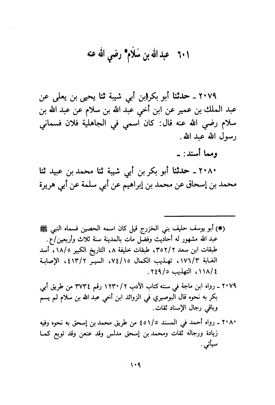 2079 - حَدَّثَنَا أَبُو بَكْرِ بْنُ أَبِي شَيْبَةَ، ثنا يَحْيَى بْنُ يَعْلَى، عَنْ عَبْدِ الْمَلِكِ بْنِ عُمَيْرٍ، عَنِ ابْنِ أَخِي عَبْدِ اللَّهِ بْنِ سَلَامٍ، عَنْ عَبْدِ اللَّهِ بْنِ سَلَامٍ، رَضِيَ اللَّهُ عَنْهُ قَالَ: «§كَانَ اسْمِي فِي الْجَاهِلِيَّةِ فُلَانٌ، فَسَمَّانِي رَسُولُ اللَّهِ عَبْدَ اللَّهِ» وَمِمَّا أَسْنَدَ: