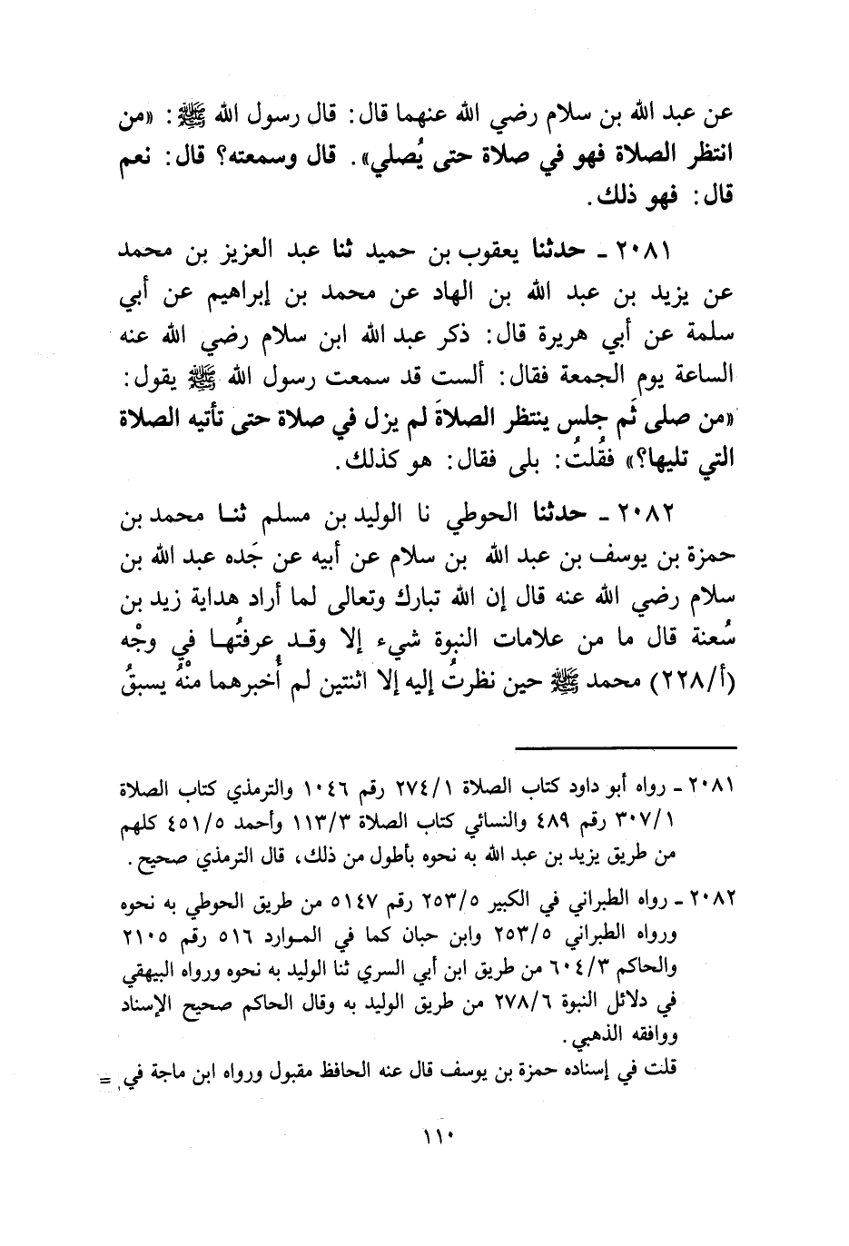 2081 - حَدَّثَنَا يَعْقُوبُ بْنُ حُمَيْدٍ، ثنا عَبْدُ الْعَزِيزِ بْنُ مُحَمَّدٍ، عَنْ يَزِيدَ بْنِ عَبْدِ اللَّهِ بْنِ الْهَادِ، عَنْ مُحَمَّدِ بْنِ إِبْرَاهِيمَ، عَنْ أَبِي سَلَمَةَ، عَنْ أَبِي هُرَيْرَةَ، قَالَ: ذَكَرَ عَبْدُ اللَّهِ بْنُ سَلَامٍ رَضِيَ اللَّهُ عَنْهُ السَّاعَةَ يَوْمَ الْجُمُعَةِ فَقَالَ: أَلَسْتَ قَدْ سَمِعْتَ رَسُولَ اللَّهِ صَلَّى اللهُ عَلَيْهِ وَسَلَّمَ يَقُولُ: «§مَنْ صَلَّى ثُمَّ جَلَسَ يَنْتَظِرُ الصَّلَاةَ لَمْ يَزَلْ فِي صَلَاةٍ حَتَّى تَأْتِيَهُ الصَّلَاةُ الَّتِي تَلِيهَا» فَقُلْتُ: بَلَى، فَقَالَ: هُوَ كَذَلِكَ "