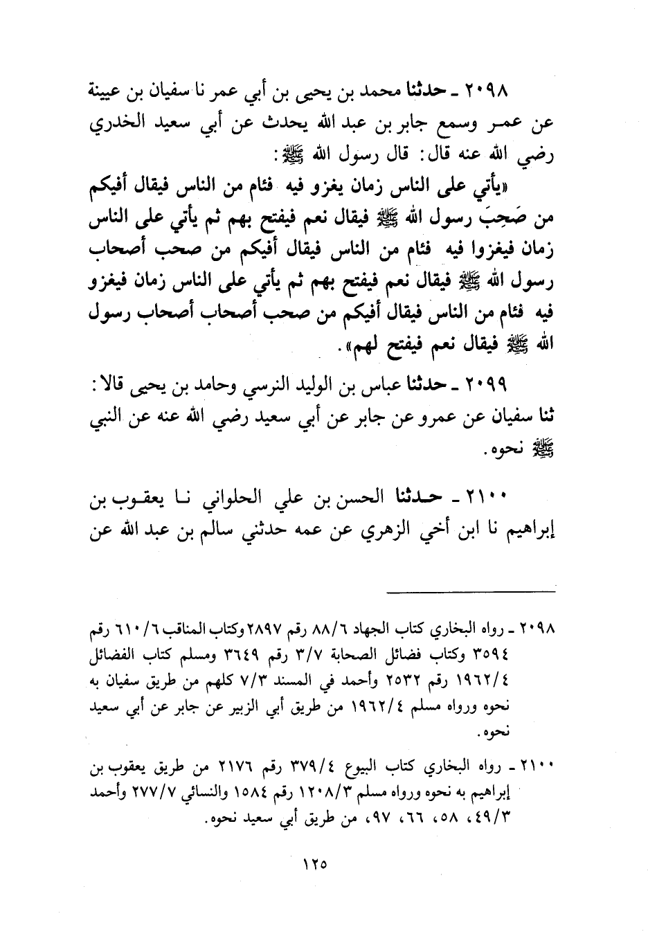 2098 - حَدَّثَنَا مُحَمَّدُ بْنُ يَحْيَى بْنِ أَبِي عُمَرَ، نا سُفْيَانُ بْنُ عُيَيْنَةَ، عَنْ عُمَرَ، وَسَمِعَ جَابِرَ بْنَ عَبْدِ اللَّهِ، يُحَدِّثُ عَنْ أَبِي سَعِيدٍ الْخُدْرِيِّ، رَضِيَ اللَّهُ عَنْهُ قَالَ: قَالَ رَسُولُ اللَّهِ صَلَّى اللهُ عَلَيْهِ وَسَلَّمَ: " §يَأْتِي عَلَى النَّاسِ زَمَانٌ يَغْزُو فِيهِ فِئَامٌ مِنَ النَّاسِ فَيُقَالُ أَفِيكُمْ مَنْ صَحِبَ رَسُولَ اللَّهِ صَلَّى اللهُ عَلَيْهِ وَسَلَّمَ فَيُقَالُ نَعَمْ فَيُفْتَحُ بِهِمْ، ثُمَّ يَأْتِي عَلَى النَّاسِ زَمَانٌ فَيَغْزُو فِيهِ فِئَامٌ مِنَ النَّاسِ فَيُقَالُ أَفِيكُمْ مَنْ صَحِبَ أَصْحَابَ رَسُولِ اللَّهِ صَلَّى اللهُ عَلَيْهِ وَسَلَّمَ فَيُقَالُ: نَعَمْ فَيُفْتَحُ بِهِمْ، ثُمَّ يَأْتِي عَلَى النَّاسِ زَمَانٌ فَيَغْزُو فِيهِ فِئَامٌ مِنَ النَّاسِ فَيُقَالُ أَفِيكُمْ مَنْ صَحِبَ أَصْحَابَ أَصْحَابِ رَسُولِ اللَّهِ صَلَّى اللهُ عَلَيْهِ وَسَلَّمَ فَيُقَالُ نَعَمْ فَيُفْتَحُ لَهُمْ "