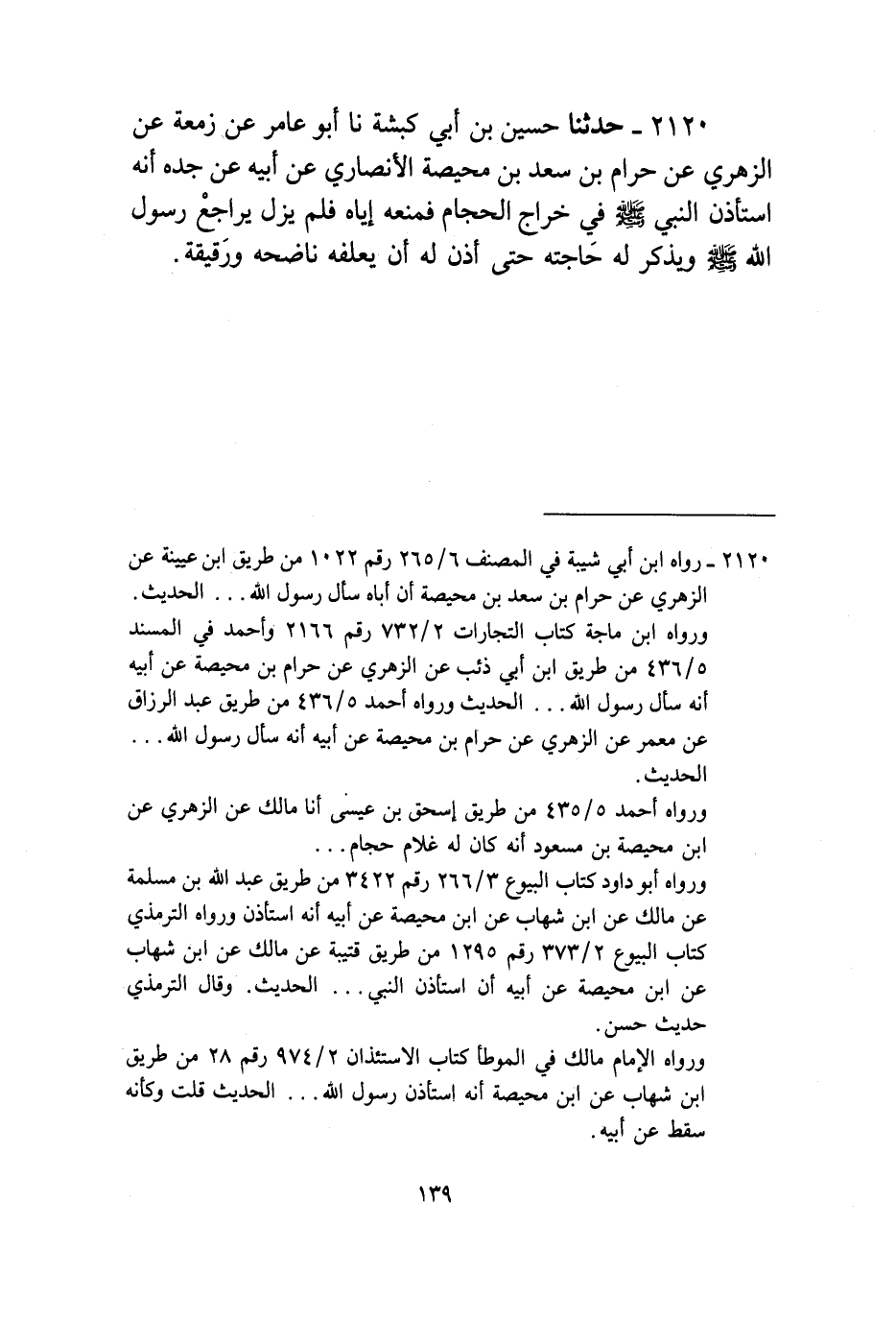2120 - حَدَّثَنَا حُسَيْنُ بْنُ أَبِي كَبْشَةَ، نا أَبُو عَامِرٍ، عَنْ زَمْعَةَ، عَنِ الزُّهْرِيِّ، عَنْ حَرَامِ بْنِ سَعْدِ بْنِ مُحَيِّصَةَ الْأَنْصَارِيِّ، عَنْ أَبِيهِ، عَنْ جَدِّهِ، «أَنَّهُ اسْتَأْذَنَ النَّبِيَّ صَلَّى اللهُ عَلَيْهِ وَسَلَّمَ §فِي خَرَاجِ الْحَجَّامِ فَمَنَعَهُ إِيَّاهُ فَلَمْ يَزَلْ يُرَاجِعُ رَسُولَ اللَّهِ صَلَّى اللهُ عَلَيْهِ وَسَلَّمَ وَيَذْكُرُ لَهُ حَاجَتَهُ حَتَّى أَذِنَ لَهُ أَنْ يَعْلِفَهُ نَاضِحَهُ وَرَقِيقَهُ»