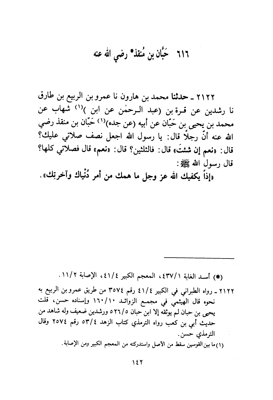 2122 - حَدَّثَنَا مُحَمَّدُ بْنُ هَارُونَ، نا عَمْرُو بْنُ الرَّبِيعِ بْنِ طَارِقٍ، نا رِشْدِينُ، عَنْ قُرَّةَ بْنِ عَبْدِ الرَّحْمَنِ، عَنِ ابْنِ شِهَابٍ، عَنْ مُحَمَّدِ بْنِ يَحْيَى بْنِ حَبَّانَ، عَنْ أَبِيهِ، عَنْ جَدِّهِ، حَبَّانَ بْنِ مُنْقِذٍ رَضِيَ اللَّهُ عَنْهُ أَنَّ رَجُلًا، قَالَ: يَا رَسُولَ اللَّهِ أجْعَلُ نِصْفَ صَلَاتِي عَلَيْكَ؟ قَالَ: «§نَعَمْ إِنْ شِئْتَ» قَالَ: فَالثُّلُثَيْنِ قَالَ: «نَعَمْ» قَالَ: فَصَلَاتِي كُلَّهَا؟ قَالَ رَسُولُ اللَّهِ صَلَّى اللهُ عَلَيْهِ وَسَلَّمَ: «إِذًا يَكْفِيكَ اللَّهُ عَزَّ وَجَلَّ مَا هَمَّكَ مِنْ أَمْرِ دُنْيَاكَ وَآخِرَتِكَ»