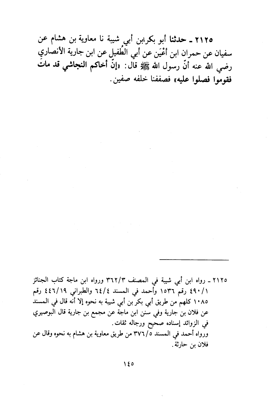 2125 - حَدَّثَنَا أَبُو بَكْرِ بْنُ أَبِي شَيْبَةَ، نا مُعَاوِيَةُ بْنُ هِشَامٍ، عَنْ سُفْيَانَ، عَنْ حُمْرَانَ بْنِ أَعْيَنَ، عَنْ أَبِي الطُّفَيْلِ، عَنِ ابْنِ جَارِيَةَ الْأَنْصَارِيِّ، رَضِيَ اللَّهُ عَنْهُ أَنَّ رَسُولَ اللَّهِ صَلَّى اللهُ عَلَيْهِ وَسَلَّمَ قَالَ: «إِنَّ §أَخَاكُمُ النَّجَاشِيَّ قَدْ مَاتَ فَقُومُوا فَصَلُّوا عَلَيْهِ» فَصُفِفْنَا خَلْفَهُ صَفَّيْنِ "