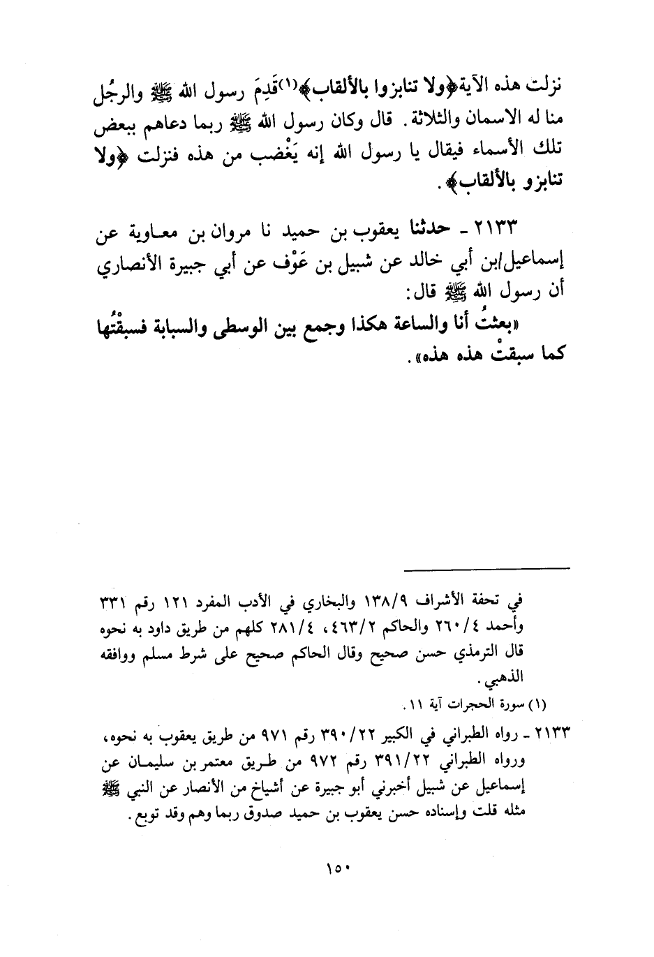 2133 - حَدَّثَنَا يَعْقُوبُ بْنُ حُمَيْدٍ، نا مَرْوَانُ بْنُ مُعَاوِيَةَ، عَنْ إِسْمَاعِيلَ بْنِ أَبِي خَالِدٍ، عَنْ شُبَيْلِ بْنِ عَوْفٍ، عَنْ أَبِي جَبِيرَةَ الْأَنْصَارِيِّ، أَنَّ رَسُولَ اللَّهِ صَلَّى اللهُ عَلَيْهِ وَسَلَّمَ قَالَ: «§بُعِثْتُ أَنَا وَالسَّاعَةُ هَكَذَا» وَجَمَعَ بَيْنَ الْوُسْطَى وَالسَّبَّابَةِ «فَسَبَقْتُهَا كَمَا سَبَقَتْ هَذِهِ هَذِهِ»