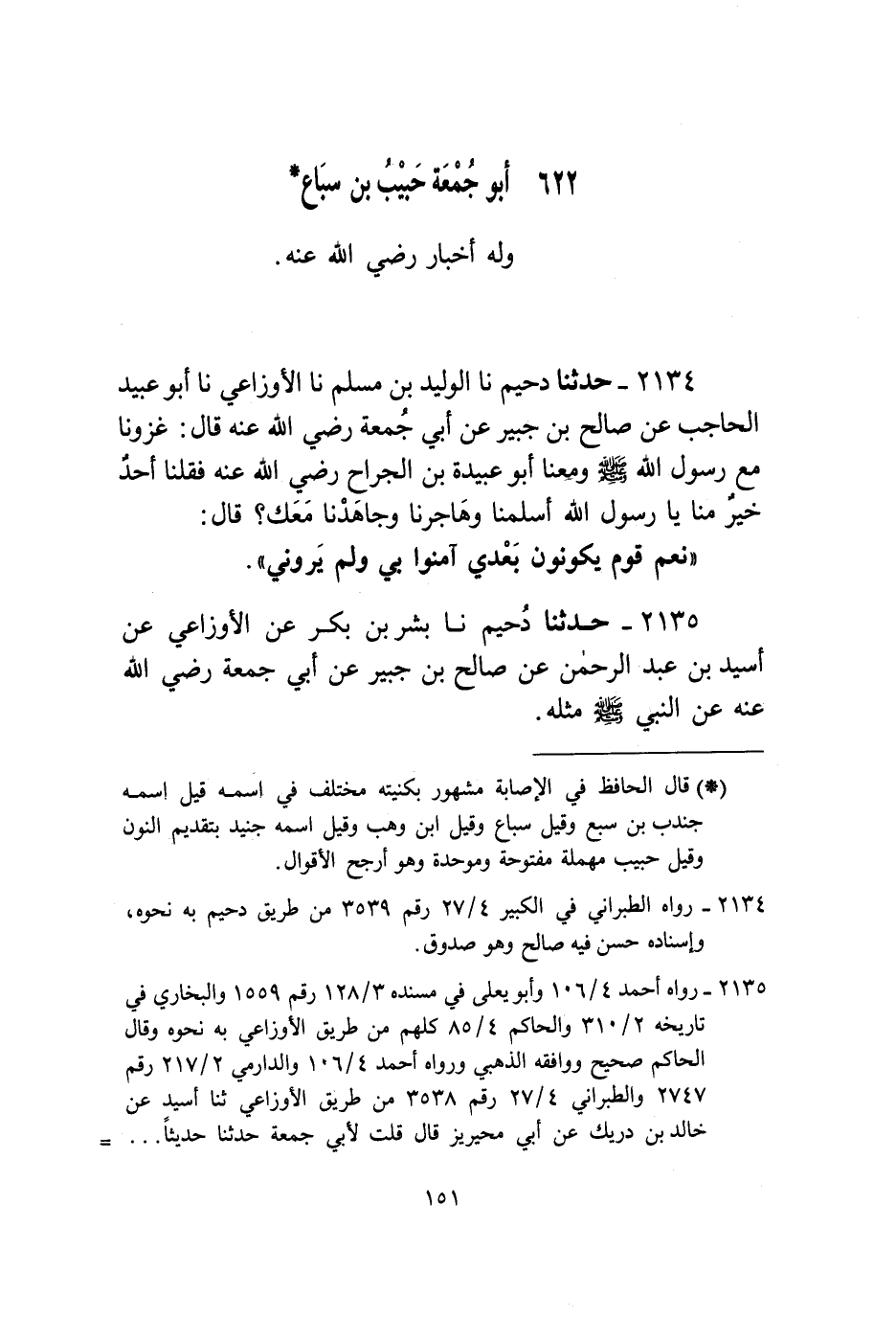 2134 - حَدَّثَنَا دُحَيْمٌ، نا الْوَلِيدُ بْنُ مُسْلِمٍ، نا الْأَوْزَاعِيُّ، نا أَبُو عُبَيْدٍ الْحَاجِبُ، عَنْ صَالِحِ بْنِ جُبَيْرٍ، عَنْ أَبِي جُمُعَةَ، رَضِيَ اللَّهُ عَنْهُ قَالَ: " §غَزَوْنَا مَعَ رَسُولِ اللَّهِ صَلَّى اللهُ عَلَيْهِ وَسَلَّمَ وَمَعَنَا أَبُو عُبَيْدَةَ بْنُ الْجَرَّاحِ رَضِيَ اللَّهُ عَنْهُ فَقُلْنَا: أَحَدٌ خَيْرٌ مِنَّا يَا رَسُولَ اللَّهِ أَسْلَمْنَا، وَهَاجَرْنا، وَجَاهَدْنَا مَعَكَ، قَالَ: «نَعَمْ قَوْمٌ يَكُونُونَ بَعْدِي آمَنُوا بِي وَلَمْ يَرَوْنِي»