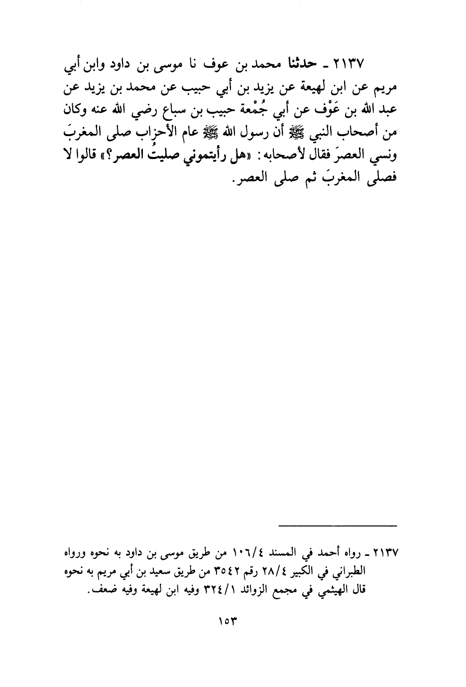 2137 - حَدَّثَنَا مُحَمَّدُ بْنُ عَوْفٍ، نا مُوسَى بْنُ دَاوُدَ، وَابْنُ أَبِي مَرْيَمَ، عَنِ ابْنِ لَهِيعَةَ، عَنْ يَزِيدَ بْنِ أَبِي حَبِيبٍ، عَنْ مُحَمَّدِ بْنِ يَزِيدَ، عَنْ عَبْدِ اللَّهِ بْنِ عَوْفٍ، عَنْ أَبِي جُمُعَةَ، حَبِيبِ بْنِ سِبَاعٍ رَضِيَ اللَّهُ عَنْهُ وَكَانَ مِنْ أَصْحَابِ النَّبِيِّ صَلَّى اللهُ عَلَيْهِ وَسَلَّمَ أَنَّ رَسُولَ اللَّهِ صَلَّى اللهُ عَلَيْهِ وَسَلَّمَ عَامَ الْأَحْزَابِ صَلَّى الْمَغْرِبَ وَنَسِيَ الْعَصْرَ فَقَالَ لِأَصْحَابِهِ: «§هَلْ رَأَيْتُمُونِي صَلَّيْتُ الْعَصْرَ» قَالُوا: لَا فَصَلَّى الْمَغْرِبَ ثُمَّ صَلَّى الْعَصْرَ "