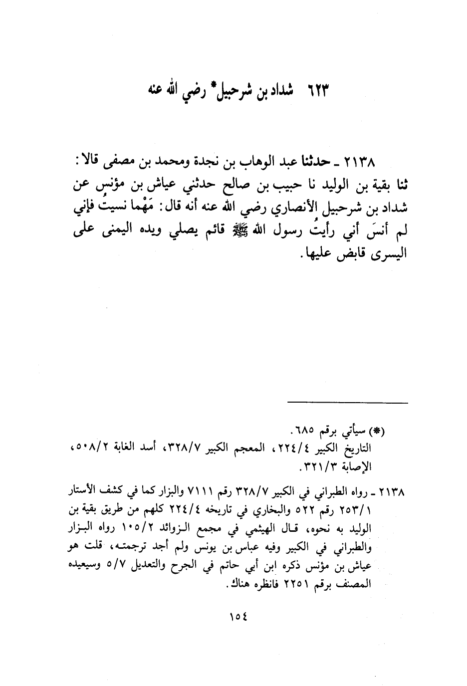 2138 - حَدَّثَنَا عَبْدُ الْوَهَّابِ بْنُ نَجْدَةَ، وَمُحَمَّدُ بْنُ مُصَفَّى، قَالَا: ثنا بَقِيَّةُ بْنُ الْوَلِيدِ، نا حَبِيبُ بْنُ صَالِحٍ، حَدَّثَنِي عَيَّاشُ بْنُ مُؤْنِسٍ، عَنْ شَدَّادِ بْنِ شُرَحْبِيلَ الْأَنْصَارِيِّ، رَضِيَ اللَّهُ عَنْهُ أَنَّهُ قَالَ: " §مَهْمَا نَسِيتُ فَإِنِّي لَمْ أَنْسَ أَنِّي رَأَيْتُ رَسُولَ اللَّهِ صَلَّى اللهُ عَلَيْهِ وَسَلَّمَ قَائِمًا يُصَلِّي وَيَدُهُ الْيُمْنَى عَلَى الْيُسْرَى قَابِضًا عَلَيْهَا