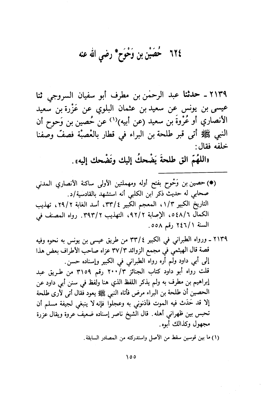 2139 - حَدَّثَنَا عَبْدُ الرَّحْمَنِ بْنُ مُطَرِّفٍ أَبُو سُفْيَانَ السُّرُوجِيُّ، ثنا عِيسَى بْنُ يُونُسَ، عَنْ سَعِيدِ بْنِ عُثْمَانَ الْبَلَوِيِّ، عَنْ عَزْرَةَ بْنِ سَعِيدٍ الْأَنْصَارِيِّ، أَوْ عُرْوَةَ بْنِ سَعِيدٍ عَنْ أَبِيهِ، عَنْ حَصِينِ بْنِ وَحْوَحٍ، أَنَّ النَّبِيَّ صَلَّى اللهُ عَلَيْهِ وَسَلَّمَ أَتَى قَبْرَ طَلْحَةَ بْنِ الْبَرَاءِ فِي قِطَارٍ بِالْعُصْبَةِ فَصَفَّ وَصَفَّنَا خَلْفَهُ فَقَالَ: «§اللَّهُمَّ الْقَ طَلْحَةَ يَضْحَكُ إِلَيْكَ وَتَضْحَكُ إِلَيْهِ»
