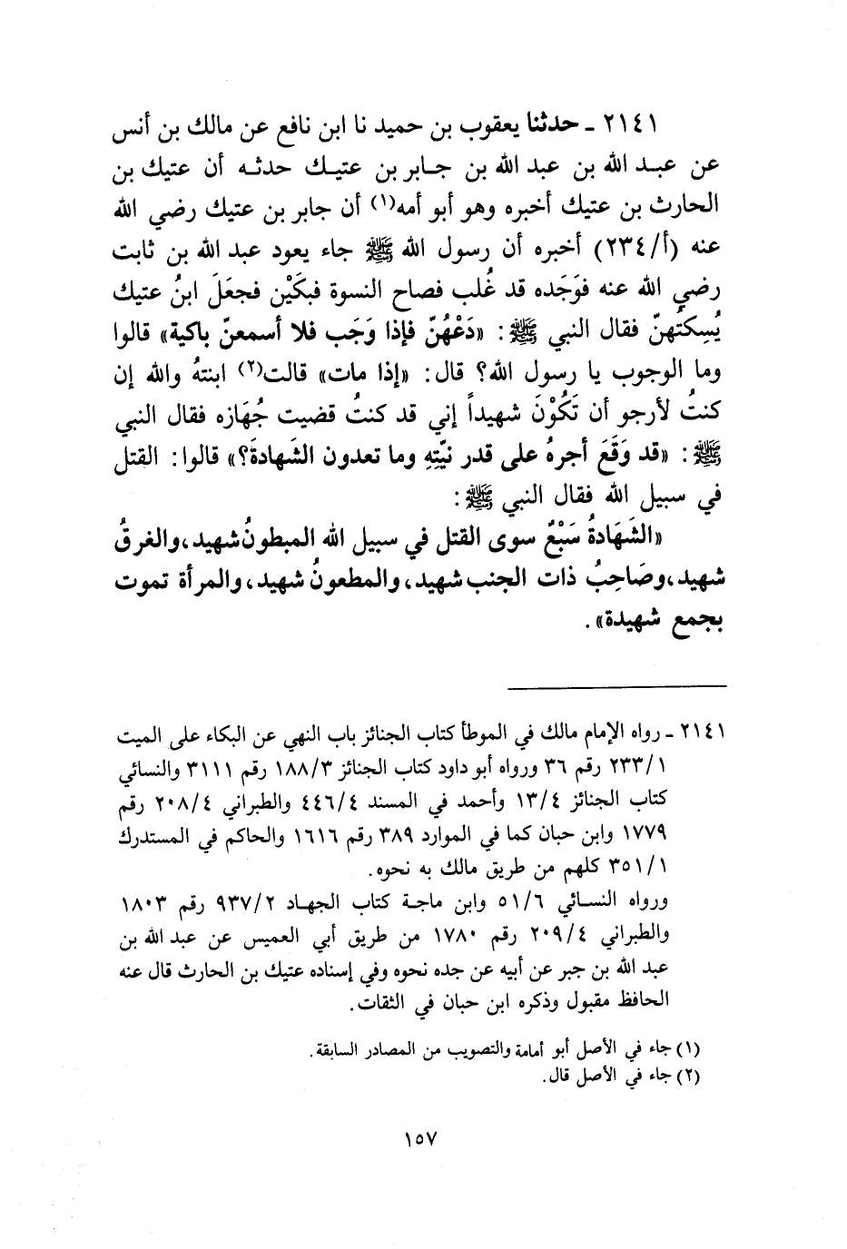 2141 - حَدَّثَنَا يَعْقُوبُ بْنُ حُمَيْدٍ، نا ابْنُ نَافِعٍ، عَنْ مَالِكِ بْنِ أَنَسٍ، عَنْ عَبْدِ اللَّهِ بْنِ عَبْدِ اللَّهِ بْنِ جَابِرِ بْنِ عَتِيكٍ، حَدَّثَهُ أَنَّ عَتِيكَ بْنَ الْحَارِثِ بْنِ عَتِيكٍ أَخْبَرَهُ وَهُوَ أَبُو أُمِّهِ أَنَّ جَابِرَ بْنَ عَتِيكٍ، رَضِيَ اللَّهُ عَنْهُ أَخْبَرَهُ " أَنَّ رَسُولَ اللَّهِ صَلَّى اللهُ عَلَيْهِ وَسَلَّمَ جَاءَ يَعُودُ عَبْدَ اللَّهِ بْنَ ثَابِتٍ رَضِيَ اللَّهُ عَنْهُ فَوَجَدَهُ قَدْ غُلِبَ فَصَاحَ النِّسْوَةُ فَبَكَيْنَ فَجَعَلَ ابْنُ عَتِيكٍ يُسْكِتُهُنَّ فَقَالَ النَّبِيُّ صَلَّى اللهُ عَلَيْهِ وَسَلَّمَ دَعْهُنَّ فَإِذَا وَجَبَ فَلَا أَسْمَعَنَّ بَاكِيَةً قَالُوا: وَمَا الْوُجُوبُ يَا رَسُولَ اللَّهِ قَالَ: إِذَا مَاتَ قَالَتِ ابْنَتُهُ وَاللَّهِ إِنْ كُنْتُ لَأَرْجُو أَنْ تَكُونَ شَهِيدًا إِنِّي قَدْ كُنْتُ قَضَيْتُ جِهَازَهُ فَقَالَ النَّبِيُّ صَلَّى اللهُ عَلَيْهِ وَسَلَّمَ: «§قَدْ وَقَعَ أَجْرُهُ عَلَى قَدْرِ نِيَّتِهِ وَمَا تَعُدُّونَ الشَّهَادَةَ؟» قَالُوا: الْقَتْلُ فِي سَبِيلِ اللَّهِ، فَقَالَ النَّبِيُّ صَلَّى اللهُ عَلَيْهِ وَسَلَّمَ: «الشَّهَادَةُ سَبْعٌ سِوَى الْقَتْلِ فِي سَبِيلِ اللَّهِ الْمَبْطُونُ شَهِيدٌ، وَالْغَرِقُ شَهِيدٌ، وَصَاحِبُ ذَاتِ الْجَنْبِ شَهِيدٌ، وَالْمَطْعُونُ شَهِيدٌ، وَالْمَرْأَةُ تَمُوتُ بِجُمْعٍ شَهِيدَةٌ»