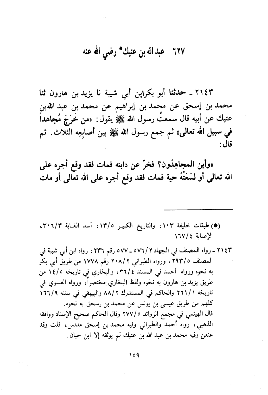 2143 - حَدَّثَنَا أَبُو بَكْرِ بْنُ أَبِي شَيْبَةَ، نا يَزِيدُ بْنُ هَارُونَ، ثنا مُحَمَّدُ بْنُ إِسْحَاقَ، عَنْ مُحَمَّدِ بْنِ إِبْرَاهِيمَ، عَنْ مُحَمَّدِ بْنِ عَبْدِ اللَّهِ بْنِ عَتِيكٍ، عَنْ أَبِيهِ، قَالَ: سَمِعْتُ، رَسُولَ اللَّهِ صَلَّى اللهُ عَلَيْهِ وَسَلَّمَ يَقُولُ: " §مَنْ خَرَجَ مُجَاهِدًا فِي سَبِيلِ اللَّهِ تَعَالَى ثُمَّ جَمَعَ رَسُولُ اللَّهِ صَلَّى اللهُ عَلَيْهِ وَسَلَّمَ بَيْنَ أَصَابِعِهِ الثَّلَاثِ ثُمَّ قَالَ: «وَأَيْنَ الْمُجَاهِدُونَ فَخَرَّ عَنْ دَابَّتِهِ فَمَاتَ فَقَدْ وَقَعَ أَجْرُهُ عَلَى اللَّهِ تَعَالَى، أَوْ لَسَعَتْهُ حَيَّةٌ فَمَاتَ فَقَدْ وَقَعَ أَجْرُهُ عَلَى اللَّهِ تَعَالَى، أَوْ مَاتَ -[160]- حَتْفَ أَنْفِهِ فَقَدْ وَقَعَ أَجْرُهُ عَلَى اللَّهِ تَعَالَى، وَمَنْ قُتِلَ قَعْصًا فَقَدِ اسْتَوْجَبَ الْمَآبَ وَالْبَابَ»