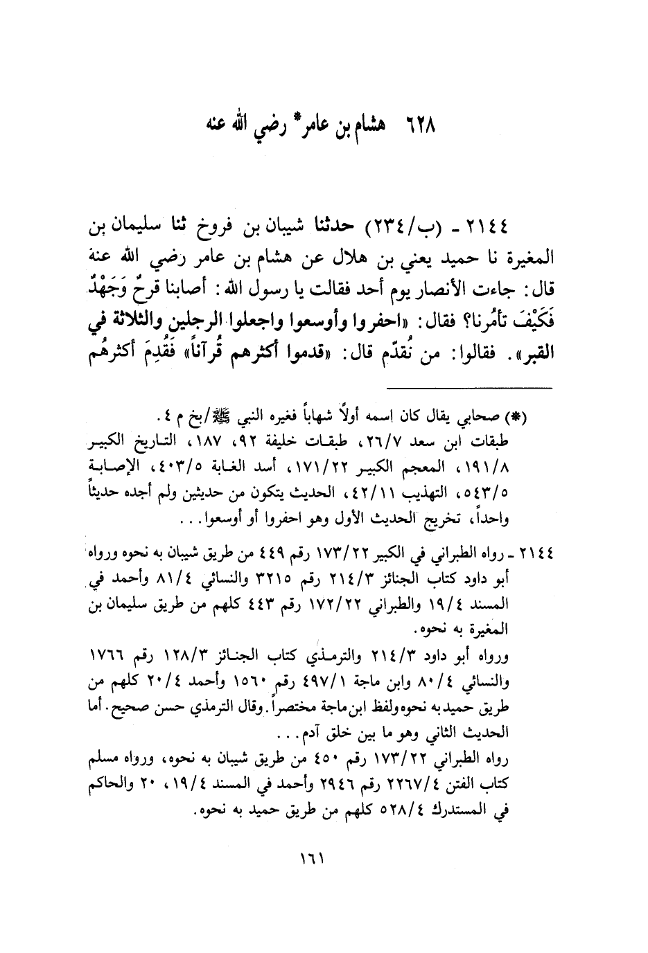 2144 - حَدَّثَنَا شَيْبَانُ بْنُ فَرُّوخَ، ثنا سُلَيْمَانُ بْنُ الْمُغِيرَةِ، نا حُمَيْدٌ يَعْنِي ابْنَ هِلَالٍ، عَنْ هِشَامِ بْنِ عَامِرٍ، رَضِيَ اللَّهُ عَنْهُ قَالَ: " §جَاءَتِ الْأَنْصَارُ يَوْمَ أُحُدٍ فَقَالَتْ: يَا رَسُولَ اللَّهِ أَصَابَنَا قَرْحٌ وَجَهْدٌ فَكَيْفَ تَأْمُرُنَا فَقَالَ: " احْفُرُوا وَأَوْسِعُوا وَاجْعَلُوا الرِّجْلَيْنِ وَالثَّلَاثَةَ فِي الْقَبْرِ فَقَالُوا مَنْ نُقَدِّمُ قَالَ: قَدِّمُوا أَكْثَرَهُمْ قُرْآنًا فَقَدَّمَ أَكْثَرَهُمْ -[162]- قُرْآنًا قَالَ: فَقَدَّمُوا أَبِي بَيْنَ يَدَيْ رَجُلَيْنِ قَالَ: وَكَانَ هِشَامُ بْنُ عَامِرٍ مَرَّ فِي أُنَاسٍ يَتَخَطَّوْنَهُ إِلَى عِمْرَانَ بْنِ حَصِينٍ وَإِلَى غَيْرِهِ مِنْ أَصْحَابِ النَّبِيِّ صَلَّى اللهُ عَلَيْهِ وَسَلَّمَ فَغَضِبَ وَقَالَ: إِنَّكُمْ لَتَخُطُّونَ إِلَى مَنْ لَمْ يَكُنْ أُحْضِرَ لِقَوْلِ رَسُولِ اللَّهِ صَلَّى اللهُ عَلَيْهِ وَسَلَّمَ وَلَا أَوْعَى لِحَدِيثِهِ مِنِّي لَقَدْ سَمِعْتُ رَسُولَ اللَّهِ صَلَّى اللهُ عَلَيْهِ وَسَلَّمَ يَقُولُ: «مَا بَيْنَ خَلْقِ آدَمَ عَلَيْهِ السَّلَامُ إِلَى أَنْ تَقُومَ السَّاعَةُ فِتْنَةٌ أَكْبَرُ مِنَ الدَّجَّالِ»