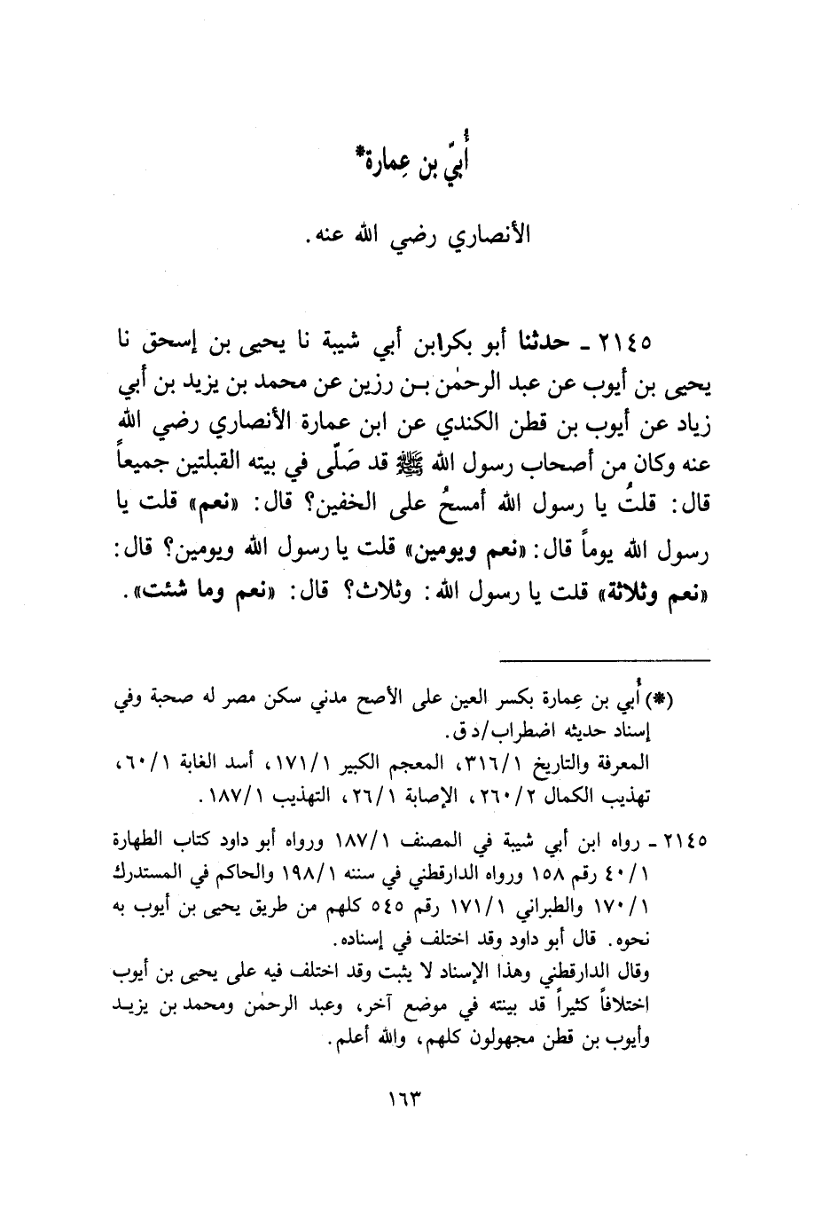 2145 - حَدَّثَنَا أَبُو بَكْرِ بْنُ أَبِي شَيْبَةَ، نا يَحْيَى بْنُ إِسْحَاقَ، نا يَحْيَى بْنُ أَيُّوبَ، عَنْ عَبْدِ الرَّحْمَنِ بْنِ رَزِينَ، عَنْ مُحَمَّدِ بْنِ يَزِيدَ بْنِ أَبِي زِيَادٍ، عَنْ أَيُّوبَ بْنِ قَطَنٍ الْكِنْدِيِّ، عَنِ ابْنِ عُمَارَةَ الْأَنْصَارِيِّ، رَضِيَ اللَّهُ عَنْهُ وَكَانَ مِنْ أَصْحَابِ رَسُولِ اللَّهِ صَلَّى اللهُ عَلَيْهِ وَسَلَّمَ §قَدْ صَلَّى فِي بَيْتِهِ الْقِبْلَتَيْنِ جَمِيعًا، قَالَ: قُلْتُ: يَا رَسُولَ اللَّهِ أَمْسَحُ عَلَى الْخُفَّيْنِ؟ قَالَ: «نَعَمْ» ، قُلْتُ: يَا رَسُولَ اللَّهِ يَوْمًا؟ قَالَ: «نَعَمْ وَيَوْمَيْنِ» قُلْتُ: يَا رَسُولَ اللَّهِ: وَيَوْمَيْنِ قَالَ: «نَعَمْ وَثَلَاثَةً» قُلْتُ: يَا رَسُولَ اللَّهِ: وَثَلَاثًا؟ قَالَ: «نَعَمْ وَمَا شِئْتَ» -[164]- قَالَ ابْنُ أَبِي عَاصِمٍ رَحِمَهُ اللَّهُ: وَهَذَا يَقُولُونَ عَنْ عُبَادَةَ بْنِ نَسِيٍّ عَنْ أُبَيٍّ هُوَ ابْنُ عُمَارَةَ
