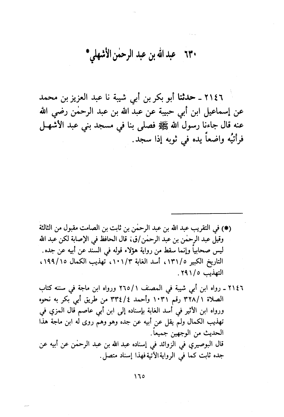 2146 - حَدَّثَنَا أَبُو بَكْرِ بْنُ أَبِي شَيْبَةَ، نا عَبْدُ الْعَزِيزِ بْنُ مُحَمَّدٍ، عَنْ إِسْمَاعِيلَ بْنِ أَبِي حَبِيبَةَ، عَنْ عَبْدِ اللَّهِ بْنِ عَبْدِ الرَّحْمَنِ، رَضِيَ اللَّهُ عَنْهُ قَالَ: «§جَاءَنَا رَسُولُ اللَّهِ صَلَّى اللهُ عَلَيْهِ وَسَلَّمَ فَصَلَّى بِنَا فِي مَسْجِدِ بَنِي عَبْدِ الْأَشْهَلِ فَرَأَيْتُهُ وَاضِعًا يَدَهُ فِي ثَوْبِهِ إِذَا سَجَدَ»