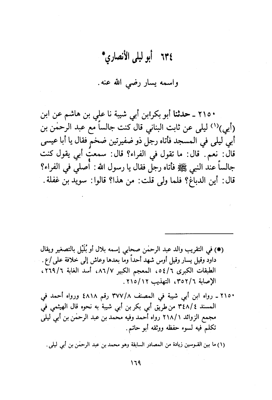 2150 - حَدَّثَنَا أَبُو بَكْرِ بْنُ أَبِي شَيْبَةَ، نا عَلِيُّ بْنُ هَاشِمٍ، عَنِ ابْنِ أَبِي لَيْلَى، عَنْ ثَابِتٍ الْبُنَانِيِّ، قَالَ: كُنْتُ جَالِسًا مَعَ عَبْدِ الرَّحْمَنِ بْنِ أَبِي لَيْلَى فِي الْمَسْجِدِ فَأَتَاهُ رَجُلٌ ذُو ضَفِيرَتَيْنِ ضَخْمٌ فَقَالَ: يَا أَبَا عِيسَى قَالَ: نَعَمْ، قَالَ: مَا تَقُولُ فِي الْفِرَاءِ قَالَ: سَمِعْتُ أَبِي يَقُولُ: كُنْتُ جَالِسًا عِنْدَ النَّبِيِّ صَلَّى اللهُ عَلَيْهِ وَسَلَّمَ فَأَتَاهُ رَجُلٌ فَقَالَ: يَا رَسُولَ اللَّهِ أُصَلِّي فِي الْفِرَاءِ؟ قَالَ: «§أَيْنَ الدَّبَّاغُ» فَلَمَّا وَلَّى قُلْتُ مَنْ هَذَا؟ قَالُوا: سُوَيْدُ بْنُ غَفَلَةَ "
