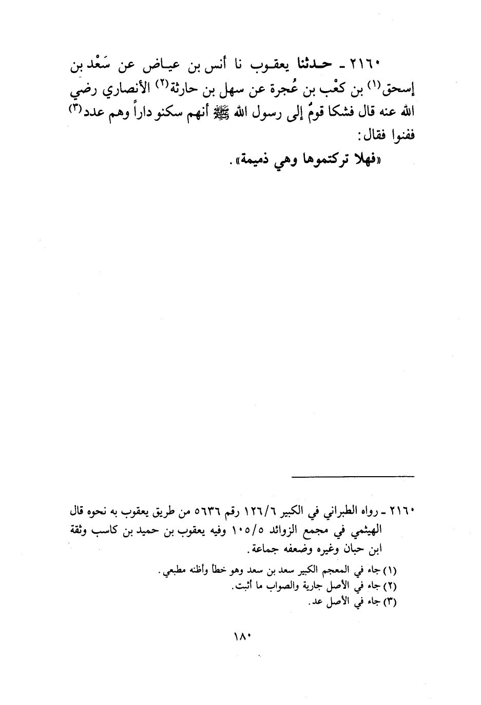2160 - حَدَّثَنَا يَعْقُوبُ، نا أَنَسُ بْنُ عِيَاضٍ، عَنْ سَعْدِ بْنِ إِسْحَاقَ بْنِ كَعْبِ بْنِ عُجْرَةَ، عَنْ سَهْلِ بْنِ حَارِثَةَ الْأَنْصَارِيِّ، رَضِيَ اللَّهُ عَنْهُ قَالَ: فَشَكَا قَوْمٌ إِلَى رَسُولِ اللَّهِ صَلَّى اللهُ عَلَيْهِ وَسَلَّمَ أَنَّهُمْ سَكَنُوا دَارًا وَهُمْ عَدَدٌ فَفَنَوْا فَقَالَ: «§فَهَلَّا تَرَكْتُمُوهَا وَهِيَ ذَمِيمَةٌ»
