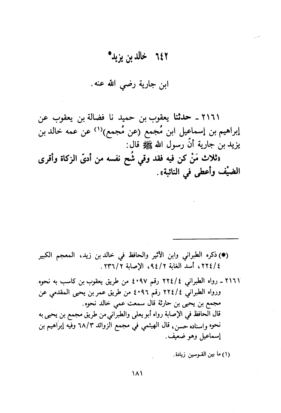 2161 - حَدَّثَنَا يَعْقُوبُ بْنُ حُمَيْدٍ، نا فَضَالَةُ بْنُ يَعْقُوبَ، عَنْ إِبْرَاهِيمَ بْنِ إِسْمَاعِيلَ بْنِ مُجَمِّعٍ، عَنْ مُجَمِّعٍ، عَنْ عَمِّهِ خَالِدِ بْنِ يَزِيدَ بْنِ جَارِيَةَ أَنَّ رَسُولَ اللَّهِ صَلَّى اللهُ عَلَيْهِ وَسَلَّمَ قَالَ: «§ثَلَاثٌ مَنْ كُنَّ فِيهِ فَقَدْ وُقِيَ شُحَّ نَفْسِهِ مَنْ أَدَّى الزَّكَاةَ، وَأَقْرَى الضَّيْفَ، وَأَعْطَى فِي النَّائِبَةِ»