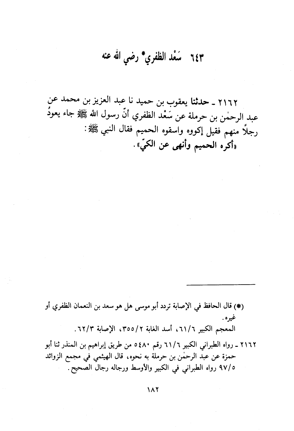 2162 - حَدَّثَنَا يَعْقُوبُ بْنُ حُمَيْدٍ، نا عَبْدُ الْعَزِيزِ بْنُ مُحَمَّدٍ، عَنْ عَبْدِ الرَّحْمَنِ بْنِ حَرْمَلَةَ، عَنْ سَعْدٍ الظَّفَرِيِّ، أَنَّ رَسُولَ اللَّهِ صَلَّى اللهُ عَلَيْهِ وَسَلَّمَ جَاءَ يَعُودُ رَجُلًا مِنْهُمْ فَقِيلَ: اكْوُوهُ وَاسْقُوهُ الْحَمِيمَ، فَقَالَ النَّبِيُّ صَلَّى اللهُ عَلَيْهِ وَسَلَّمَ: «§أَكْرَهُ الْحَمِيمَ، وَأَنْهَى عَنِ الْكَيِّ»