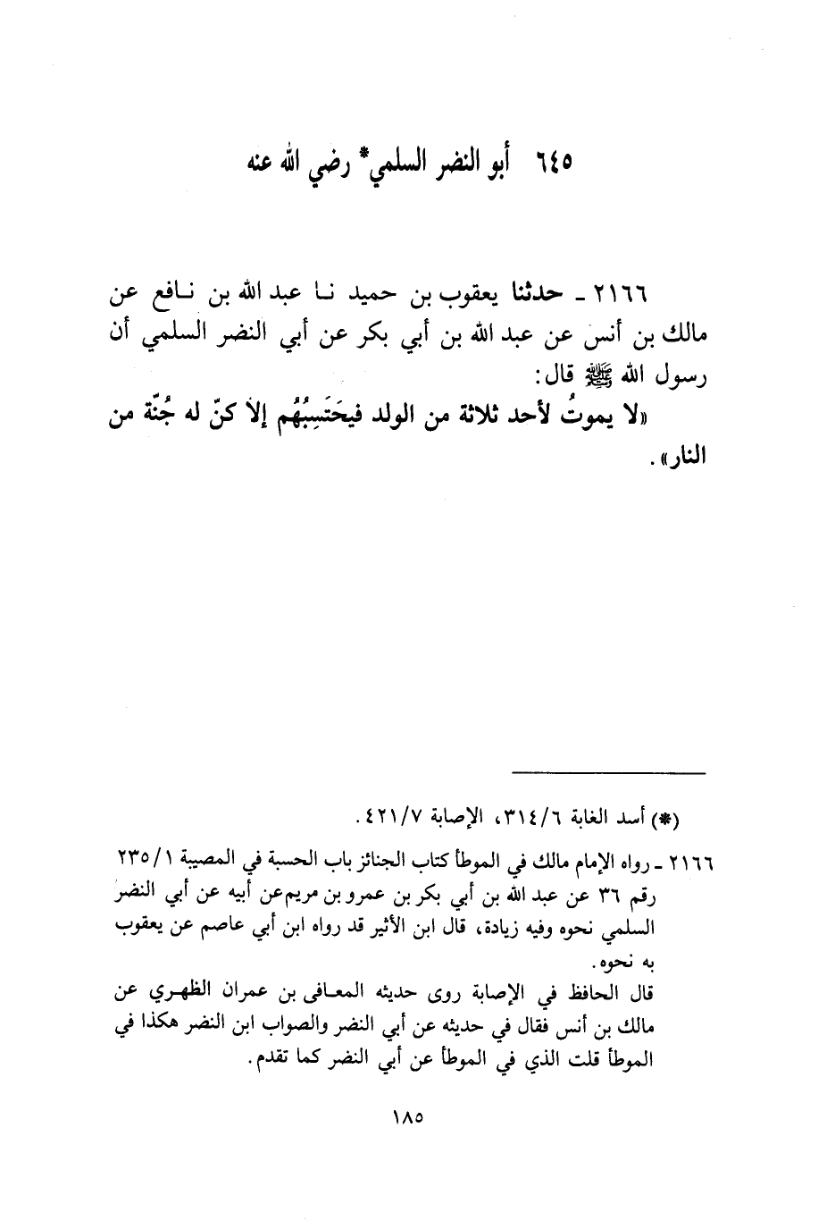 2166 - حَدَّثَنَا يَعْقُوبُ بْنُ حُمَيْدٍ، نا عَبْدُ اللَّهِ بْنُ نَافِعٍ، عَنْ مَالِكِ بْنِ أَنَسٍ، عَنْ عَبْدِ اللَّهِ بْنِ أَبِي بَكْرٍ، عَنْ أَبِي النَّضْرِ السَّلَمِيِّ، أَنَّ رَسُولَ اللَّهِ صَلَّى اللهُ عَلَيْهِ وَسَلَّمَ قَالَ: «§لَا يَمُوتُ لِأَحَدٍ ثَلَاثَةٌ مِنَ الْوَلَدِ فَيَحْتَسِبُهُمْ إِلَّا كُنَّ لَهُ جُنَّةً مِنَ النَّارِ»