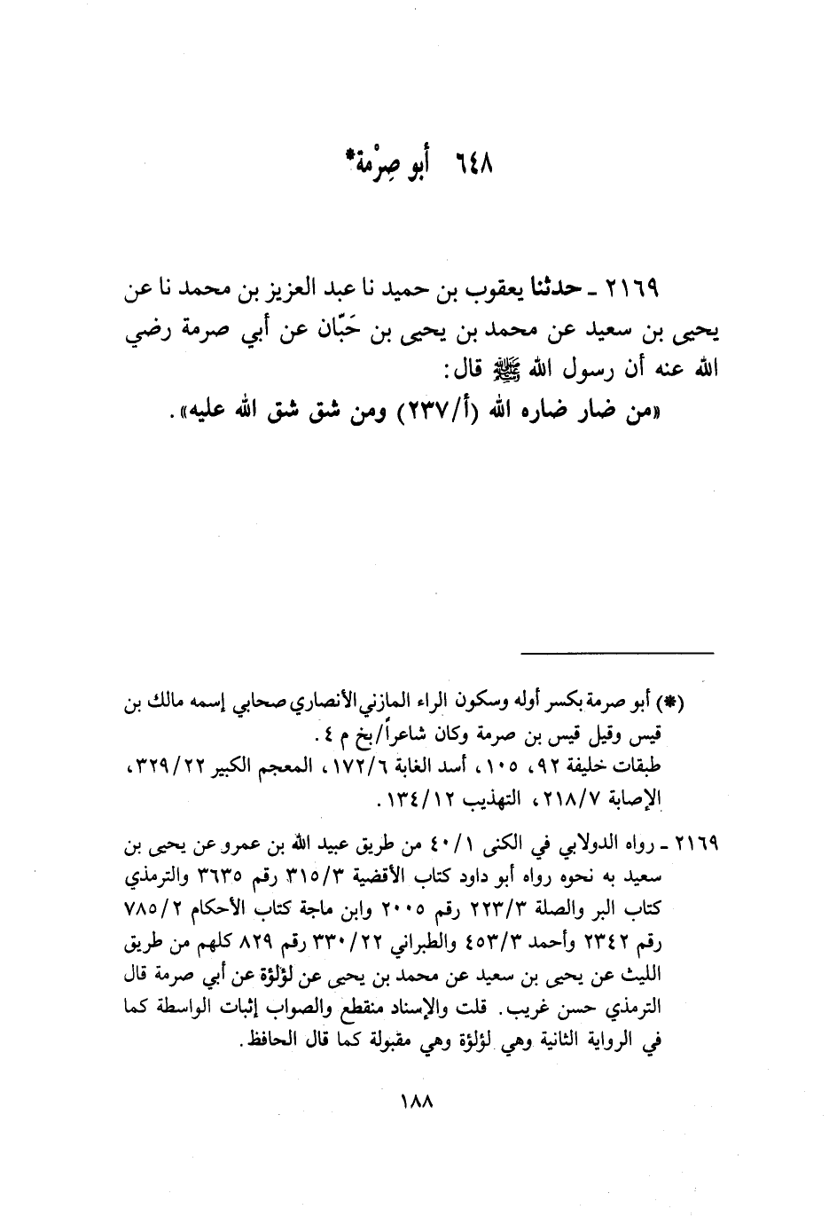 2169 - حَدَّثَنَا يَعْقُوبُ بْنُ حُمَيْدٍ، نا عَبْدُ الْعَزِيزِ بْنُ مُحَمَّدٍ، نا عَنْ يَحْيَى بْنِ سَعِيدٍ، عَنْ مُحَمَّدِ بْنِ يَحْيَى بْنِ حِبَّانَ، عَنْ أَبِي صِرْمَةَ، رَضِيَ اللَّهُ عَنْهُ أَنَّ رَسُولَ اللَّهِ صَلَّى اللهُ عَلَيْهِ وَسَلَّمَ قَالَ: «§مَنْ ضَارَّ ضَارَّهُ اللَّهُ وَمَنْ شَقَّ شَقَّ اللَّهُ عَلَيْهِ»