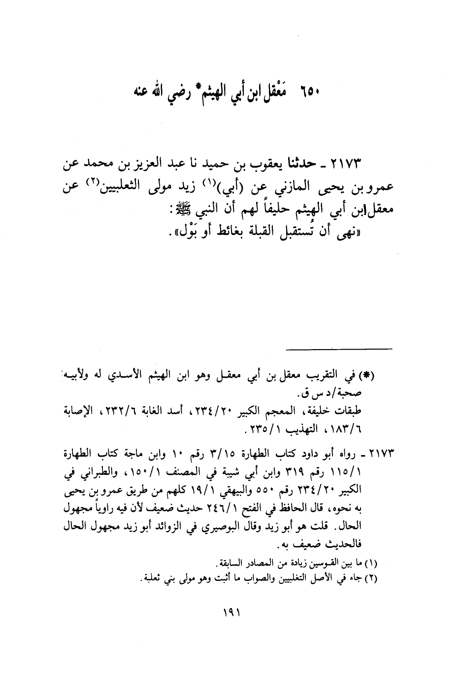 2173 - حَدَّثَنَا يَعْقُوبُ بْنُ حُمَيْدٍ، نا عَبْدُ الْعَزِيزِ بْنُ مُحَمَّدٍ، عَنْ عَمْرِو بْنِ يَحْيَى الْمَازِنِيِّ، عَنْ أَبِي زَيْدٍ، مَوْلَى الثَّعْلَبِيِّينَ عَنْ مَعْقِلِ بْنِ أَبِي الْهَيْثَمِ، حَلِيفًا لَهُمْ «أَنَّ النَّبِيَّ صَلَّى اللهُ عَلَيْهِ وَسَلَّمَ §نَهَى أَنْ تُسْتَقْبَلَ الْقِبْلَةُ بِغَائِطٍ أَوْ بَوْلٍ»