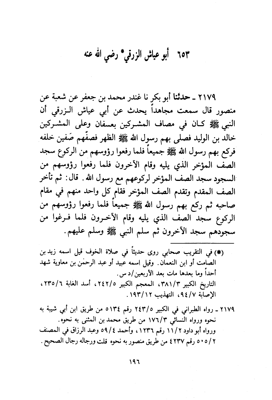 2179 - حَدَّثَنَا أَبُو بَكْرٍ، نا غُنْدَرٌ، مُحَمَّدُ بْنُ جَعْفَرٍ، عَنْ شُعْبَةَ، عَنْ مَنْصُورٍ، قَالَ: سَمِعْتُ مُجَاهِدًا، يُحَدِّثُ عَنْ أَبِي عَيَّاشٍ الزُّرَقِيِّ، أَنَّ النَّبِيَّ صَلَّى اللهُ عَلَيْهِ وَسَلَّمَ كَانَ فِي " مَصَافِّ الْمُشْرِكِينَ بِعُسْفَانَ وَعَلَى الْمُشْرِكِينَ خَالِدُ بْنُ الْوَلِيدِ فَصَلَّى بِهِمْ رَسُولُ اللَّهِ صَلَّى اللهُ عَلَيْهِ وَسَلَّمَ الظُّهْرَ فَصَفَّهُمْ صَفَّيْنِ خَلْفَهُ §فَرَكَعَ بِهِمْ رَسُولُ اللَّهِ صَلَّى اللهُ عَلَيْهِ وَسَلَّمَ جَمِيعًا، فَلَمَّا رَفَعُوا رُءُوسَهُمْ مِنَ الرُّكُوعِ سَجَدَ الصَّفُّ الْمُؤَخَّرُ الَّذِي يَلِيهِ وَقَامَ الْآخَرُونَ، فَلَمَّا رَفَعُوا رُءُوسَهُمْ مِنَ السُّجُودِ سَجَدَ الصَّفُّ الْمُؤَخَّرُ لِرُكُوعِهِمْ مَعَ رَسُولِ اللَّهِ، قَالَ: ثُمَّ تَأَخَّرَ الصَّفُّ الْمُقَدَّمُ وَتَقَدَّمَ الصَّفُّ الْمُؤَخَّرُ، فَقَامَ كُلُّ وَاحِدٍ مِنْهُمْ فِي مَقَامِ صَاحِبِهِ، ثُمَّ رَكَعَ بِهِمْ رَسُولُ اللَّهِ صَلَّى اللهُ عَلَيْهِ وَسَلَّمَ جَمِيعًا، فَلَمَّا رَفَعُوا رُءُوسَهُمْ مِنَ الرُّكُوعِ سَجَدَ الصَّفُّ الَّذِي يَلِيهِ وَقَامَ الْآخَرُونَ، فَلَمَّا فَرَغُوا مِنْ سُجُودِهِمْ سَجَدَ الْآخَرُونَ ثُمَّ سَلَّمَ النَّبِيُّ صَلَّى اللهُ عَلَيْهِ وَسَلَّمَ عَلَيْهِمْ " -[197]- قَالَ أَبُو بَكْرِ بْنُ أَبِي عَاصِمٍ: وَرَوَى حَمَّادُ بْنُ سَلَمَةَ، عَنْ سُهَيْلِ بْنِ أَبِي صَالِحٍ، عَنْ أَبِيهِ عَنْ أَبِي عَيَّاشٍ الزُّرَقِيِّ رَضِيَ اللَّهُ عَنْهُ قَالَ: قَالَ رَسُولُ اللَّهِ صَلَّى اللهُ عَلَيْهِ وَسَلَّمَ: «مَنْ قَالَ حِينَ يُصْبِحُ لَا إِلَهَ إِلَّا اللَّهُ» فَذَكَرَ الْحَدِيثَ
