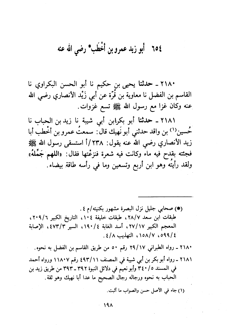 2181 - حَدَّثَنَا أَبُو بَكْرِ بْنُ أَبِي شَيْبَةَ، نا زَيْدُ بْنُ الْحُبَابِ، نا حُسَيْنُ بْنُ وَاقِدٍ، حَدَّثَنِي أَبُو نَهِيكٍ، قَالَ: سَمِعْتُ عَمْرَو بْنَ أَخْطَبَ أَبَا زَيْدٍ الْأَنْصَارِيَّ، رَضِيَ اللَّهُ عَنْهُ يَقُولُ: " §اسْتَسْقَى رَسُولُ اللَّهِ صَلَّى اللهُ عَلَيْهِ وَسَلَّمَ فَجِئْتُهُ بِقَدَحٍ فِيهِ مَاءٌ وَكَانَتْ فِيهِ شَعْرَةٌ فَنَزَعْتُهَا فَقَالَ: «اللَّهُمَّ جَمِّلْهُ» وَلَقَدْ رَأَيْتُهُ وَهُوَ ابْنُ أَرْبَعٍ وَتِسْعِينَ وَمَا فِي رَأْسِهِ طَاقَةٌ بَيْضَاءُ "