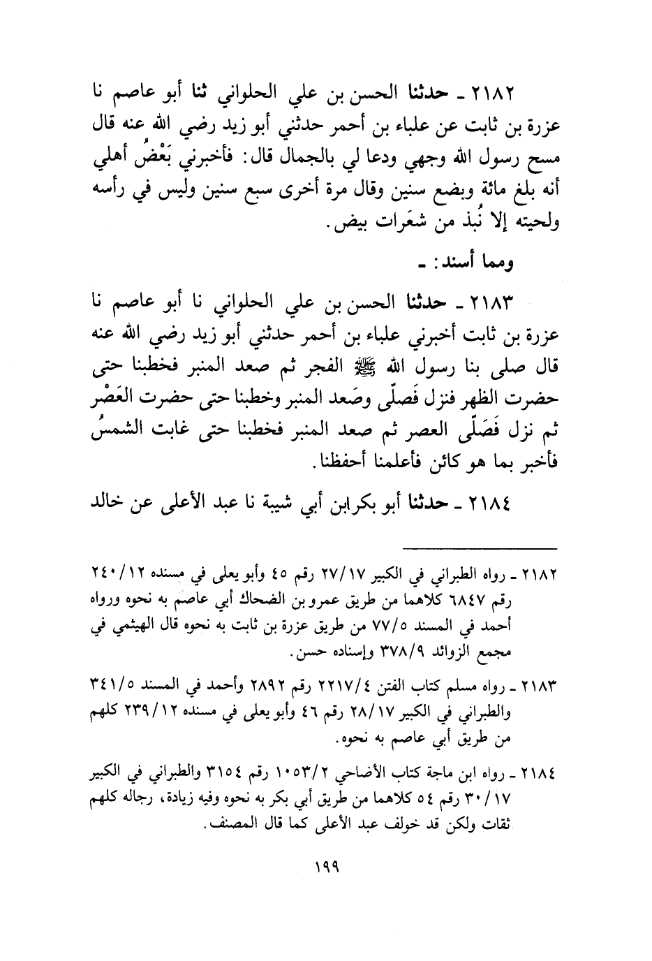 2182 - حَدَّثَنَا الْحَسَنُ بْنُ عَلِيٍّ الْحُلْوَانِيُّ، ثنا أَبُو عَاصِمٍ، نا عَزْرَةُ بْنُ ثَابِتٍ، عَنْ عِلْبَاءَ بْنِ أَحْمَرَ، حَدَّثَنِي أَبُو زَيْدٍ، رَضِيَ اللَّهُ عَنْهُ قَالَ: §مَسَحَ رَسُولُ اللَّهِ وَجْهِي وَدَعَا لِي بِالْجَمَالِ، قَالَ: فَأَخْبَرَنِي بَعْضُ أَهْلِي أَنَّهُ بَلَغَ مِائَةً وَبِضْعَ سِنِينَ وَقَالَ مَرَّةً أُخْرَى: سَبْعَ سِنِينَ وَلَيْسَ فِي رَأْسِهِ وَلِحْيَتِهِ إِلَّا نُبَذٌ مِنْ شَعَرَاتٍ بِيضٍ " وَمِمَّا أَسْنَدَ