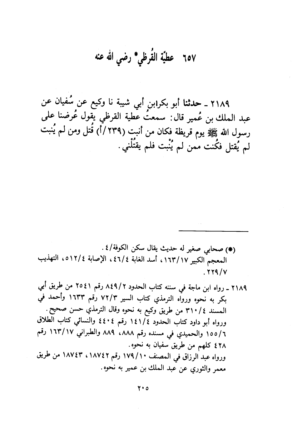 2189 - حَدَّثَنَا أَبُو بَكْرِ بْنُ أَبِي شَيْبَةَ، نا وَكِيعٌ، عَنْ سُفْيَانَ، عَنْ عَبْدِ الْمَلِكِ بْنِ عُمَيْرٍ، قَالَ: سَمِعْتُ عَطِيَّةَ الْقُرَظِيَّ، يَقُولُ: " §عُرِضْنَا عَلَى رَسُولِ اللَّهِ صَلَّى اللهُ عَلَيْهِ وَسَلَّمَ يَوْمَ قُرَيْظَةَ فَكَانَ مَنْ أَنْبَتَ قُتِلَ وَمَنْ لَمْ يُنْبِتْ لَمْ يُقْتَلْ فَكُنْتُ مِمَّنْ لَمْ يُنْبِتْ فَلَمْ يَقْتُلْنِي