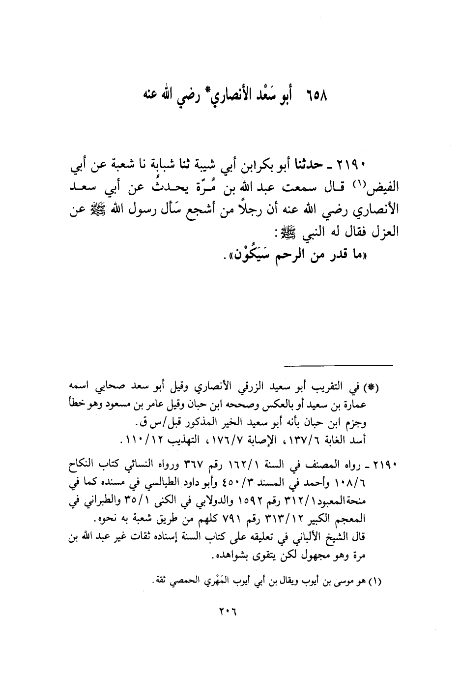 2190 - حَدَّثَنَا أَبُو بَكْرِ بْنُ أَبِي شَيْبَةَ، ثنا شَبَابَةُ، نا شُعْبَةُ، عَنْ أَبِي الْفَيْضِ، قَالَ: سَمِعْتُ عَبْدَ اللَّهِ بْنَ مُرَّةَ، يُحَدِّثُ عَنْ أَبِي سَعْدٍ الْأَنْصَارِيِّ، رَضِيَ اللَّهُ عَنْهُ أَنَّ رَجُلًا مِنْ أَشْجَعَ سَأَلَ رَسُولَ اللَّهِ صَلَّى اللهُ عَلَيْهِ وَسَلَّمَ عَنِ الْعَزْلِ فَقَالَ لَهُ النَّبِيُّ صَلَّى اللهُ عَلَيْهِ وَسَلَّمَ: «§مَا قُدِّرَ مِنَ الرَّحِمِ سَيَكُونُ»