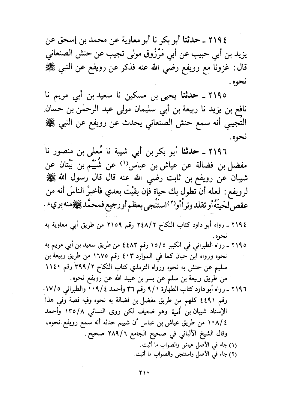 2196 - حَدَّثَنَا أَبُو بَكْرِ بْنُ أَبِي شَيْبَةَ، نا مُعَلَّى بْنُ مَنْصُورٍ، نا مُفَضَّلُ بْنُ فَضَالَةَ، عَنْ عَيَّاشِ بْنِ عَبَّاسٍ، عَنْ شُيَيْمِ بْنِ بَيْتَانَ، عَنْ شَيْبَانَ، عَنْ رُوَيْفِعِ بْنِ ثَابِتٍ، رَضِيَ اللَّهُ عَنْهُ قَالَ: قَالَ رَسُولُ اللَّهِ صَلَّى اللهُ عَلَيْهِ وَسَلَّمَ لِرُوَيْفُعٍ: «§لَعَلَّهُ أَنْ تَطُولَ بِكَ حَيَاةٌ فَإِنْ بَقِيتَ بَعْدِي فَأَخْبِرِ النَّاسَ أَنَّهُ مَنْ عَقَصَ لِحْيَتَهُ، أَوْ تَقَلَّدَ وَتَرًا، أَوِ اسْتَنْجَى بِعَظْمٍ أَوْ رَجِيعٍ فَمُحَمَّدٌ صَلَّى اللهُ عَلَيْهِ وَسَلَّمَ مِنْهُ بَرِيءٌ»