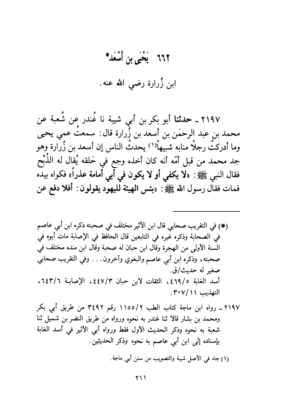 2197 - حَدَّثَنَا أَبُو بَكْرِ بْنُ أَبِي شَيْبَةَ، نا غُنْدَرٌ، عَنْ شُعْبَةَ، عَنْ مُحَمَّدِ بْنِ عَبْدِ الرَّحْمَنِ بْنِ أَسْعَدَ بْنِ زُرَارَةَ، قَالَ: سَمِعْتُ عَمِي يَحْيَى وَمَا أَدْرَكْتُ رَجُلًا مِنَّا بِهِ شَبِيهًا يُحَدِّثُ النَّاسَ: إِنَّ أَسْعَدَ بْنَ زُرَارَةَ وَهُوَ جَدُّ مُحَمَّدٍ مِنْ قِبَلِ أُمِّهِ أَنَّهُ كَانَ أَخَذَهُ وَجَعٌ فِي حَلْقِهِ يُقَالُ لَهُ الذُّبْحُ فَقَالَ النَّبِيُّ صَلَّى اللهُ عَلَيْهِ وَسَلَّمَ: «لَا يَكْفِي، أَوْ لَا يَكُونُ فِي أَبِي أُمَامَةَ عُذْرًا» فَكَوَاهُ بِيَدِهِ فَمَاتَ فَقَالَ رَسُولُ اللَّهِ صَلَّى اللهُ عَلَيْهِ وَسَلَّمَ: «بِئْسَ الْهَيْئَةُ لِلْيَهُودِ يَقُولُونَ أَفَلَا دَفَعَ عَنْ -[212]- صَاحِبِهِ؟ وَمَا أَمْلِكُ لَهُ وَلَا لِنَفْسِي شَيْئًا» وَسَمِعْتُهُ يُحَدِّثُ عَنِ النَّبِيِّ صَلَّى اللهُ عَلَيْهِ وَسَلَّمَ قَالَ: «§مَنْ سَمِعَ نِدَاءَ الْجُمُعَةِ وَلَمْ يَأْتِ طَبَعَ اللَّهُ عَزَّ وَجَلَّ عَلَى قَلْبِهِ فَجَعَلَ قَلْبَهُ قَلْبَ مُنَافِقٍ»