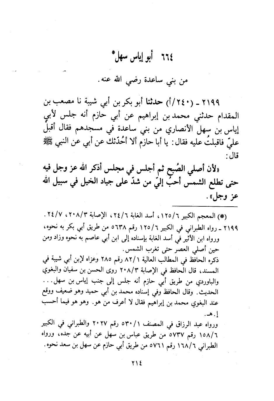 2199 - حَدَّثَنَا أَبُو بَكْرِ بْنُ أَبِي شَيْبَةَ، نا مُصْعَبُ بْنُ الْمِقْدَامِ، حَدَّثَنِي مُحَمَّدُ بْنُ إِبْرَاهِيمَ، عَنْ أَبِي حَازِمٍ، " أَنَّهُ جَلَسَ لِأَبِي إِيَاسِ بْنِ سَهْلٍ الْأَنْصَارِيِّ مِنْ بَنِي سَاعِدَةَ فِي مَسْجِدِهِمْ فَقَالَ: أَقْبِلْ عَلَيَّ فَأَقْبَلْتُ عَلَيْهِ فَقَالَ: يَا أَبَا حَازِمٍ أَلَا أُحَدِّثُكَ عَنْ أَبِي عَنِ النَّبِيِّ صَلَّى اللهُ عَلَيْهِ وَسَلَّمَ قَالَ: «§لَأَنْ أُصَلِّي الصُّبْحَ ثُمَّ أَجْلِسُ فِي مَجْلِسٍ أَذْكُرُ اللَّهَ عَزَّ وَجَلَّ فِيهِ حَتَّى تَطْلُعَ الشَّمْسُ أَحَبُّ إِلَيَّ مِنْ شَدٍّ عَلَى جِيَادِ الْخَيْلِ فِي سَبِيلِ اللَّهِ عَزَّ وَجَلَّ»
