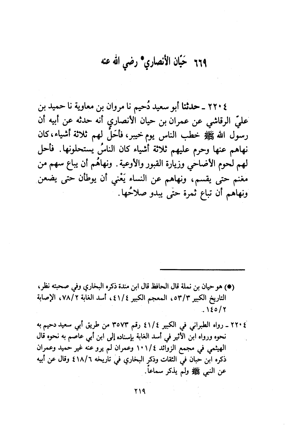 2204 - حَدَّثَنَا أَبُو سَعِيدٍ دُحَيْمٌ، نا مَرْوَانُ بْنُ مُعَاوِيَةَ، نا حُمَيْدُ بْنُ عَلِيٍّ الرَّقَاشِيُّ، عَنْ عِمْرَانَ بْنِ حَيَّانَ الْأَنْصَارِيِّ أَنَّهُ حَدَّثَهُ عَنْ أَبِيهِ، «أَنَّ رَسُولَ اللَّهِ صَلَّى اللهُ عَلَيْهِ وَسَلَّمَ §خَطَبَ النَّاسَ يَوْمَ خَيْبَرَ فَأَحَلَّ لَهُمْ ثَلَاثَةَ أَشْيَاءَ كَانَ نَهَاهُمْ عَنْهَا، وَحَرَّمَ عَلَيْهِمْ ثَلَاثَةَ أَشْيَاءَ كَانَ النَّاسُ يَسْتَحِلُّونَها فَأَحَلَّ لَهُمْ لُحُومَ الْأَضَاحِيِّ، وَزِيَارَةَ الْقُبُورِ، وَالْأَوْعِيَةَ، وَنَهَاهُمْ أَنْ يُبَاعَ سَهْمٌ مِنْ مَغْنَمٍ حَتَّى يُقَسَّمَ، وَنَهَاهُمْ عَنِ النِّسَاءِ يَعْنِي أَنْ يُوطَأْنَ حَتَّى يَضَعْنَ، وَنَهَاهُمْ أَنْ تُبَاعَ ثَمَرَةٌ حَتَّى يَبْدُو صَلَاحُهَا»