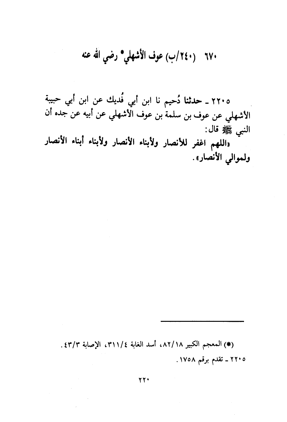 2205 - حَدَّثَنَا دُحَيْمٌ، نا ابْنُ أَبِي فُدَيْكٍ، عَنِ ابْنِ أَبِي حَبِيبَةَ الْأَشْهَلِيِّ، عَنْ عَوْفِ بْنِ سَلَمَةَ بْنِ عَوْفٍ الْأَشْهَلِيِّ، عَنْ أَبِيهِ، عَنْ جَدِّهِ، أَنَّ النَّبِيَّ صَلَّى اللهُ عَلَيْهِ وَسَلَّمَ قَالَ: «§اللَّهُمَّ اغْفِرْ لِلْأَنْصَارِ، وَلِأَبْنَاءِ الْأَنْصَارِ، وَلِأَبْنَاءِ أَبْنَاءِ الْأَنْصَارِ، وَلِمَوَالِي الْأَنْصَارِ»