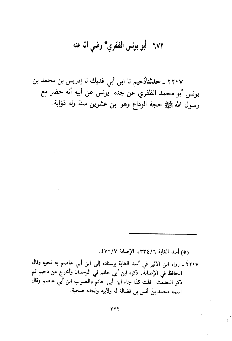2207 - حَدَّثَنَا دُحَيْمٌ، نا ابْنُ أَبِي فُدَيْكٍ، نا إِدْرِيسُ بْنُ مُحَمَّدِ بْنِ يُونُسَ أَبُو مُحَمَّدٍ الظَّفَرِيُّ، عَنْ جَدِّهِ، يُونُسَ عَنْ أَبِيهِ، «§أَنَّهُ حَضَرَ مَعَ رَسُولِ اللَّهِ صَلَّى اللهُ عَلَيْهِ وَسَلَّمَ حَجَّةَ الْوَدَاعِ وَهُوَ ابْنُ عِشْرِينَ سَنَةً وَلَهُ ذُؤَابَةٌ»
