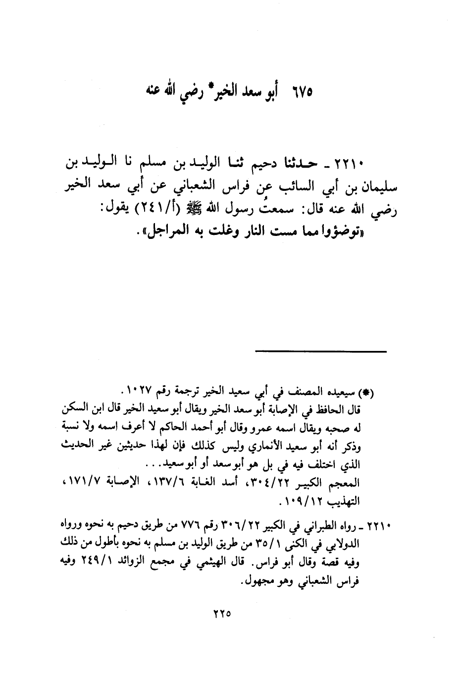 2210 - حَدَّثَنَا دُحَيْمٌ، ثنا الْوَلِيدُ بْنُ مُسْلِمٍ، نا الْوَلِيدُ بْنُ سُلَيْمَانَ بْنِ أَبِي السَّائِبِ، عَنْ فِرَاسٍ الشَّعْبَانِيِّ، عَنْ أَبِي سَعْدٍ الْخَيْرِ، رَضِيَ اللَّهُ عَنْهُ قَالَ: سَمِعْتُ رَسُولَ اللَّهِ صَلَّى اللهُ عَلَيْهِ وَسَلَّمَ يَقُولُ: «§تَوَضَّئُوا مِمَّا مَسَّتِ النَّارُ وَغَلَتْ بِهِ الْمَرَاجِلُ»