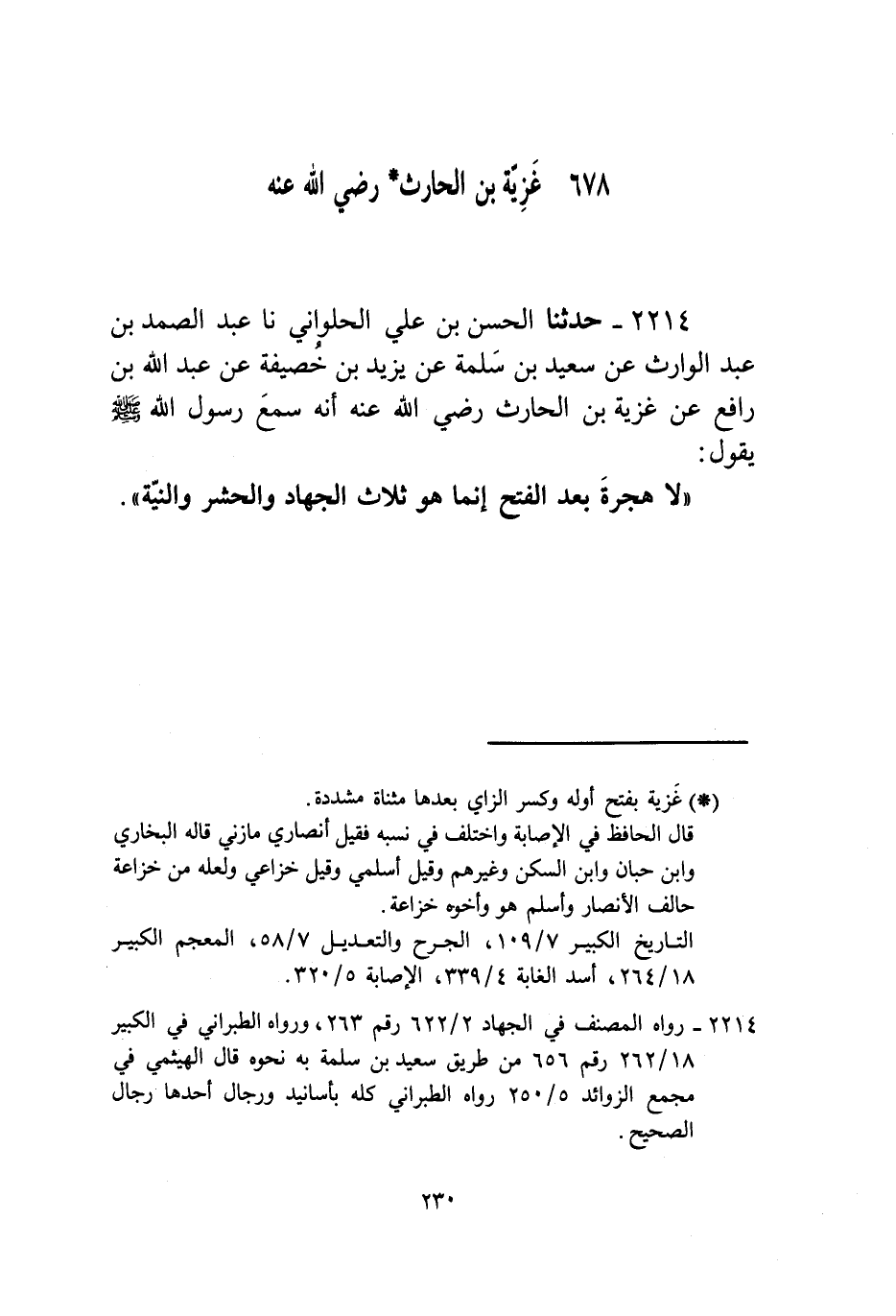 2214 - حَدَّثَنَا الْحَسَنُ بْنُ عَلِيٍّ الْحُلْوَانِيُّ، نا عَبْدُ الصَّمَدِ بْنُ عَبْدِ الْوَارِثِ، عَنْ سَعِيدِ بْنِ سَلَمَةَ، عَنْ يَزِيدَ بْنِ خُصَيْفَةَ، عَنْ عَبْدِ اللَّهِ بْنِ رَافِعٍ، عَنْ غَزِيَّةَ بْنِ الْحَارِثِ رَضِيَ اللَّهُ عَنْهُ، أَنَّهُ سَمِعَ رَسُولَ اللَّهِ صَلَّى اللهُ عَلَيْهِ وَسَلَّمَ يَقُولُ: " §لَا هِجْرَةَ بَعْدَ الْفَتْحِ، إِنَّمَا هُوَ ثَلَاثٌ: الْجِهَادُ، وَالْحَشْرُ، وَالنِّيَّةُ "