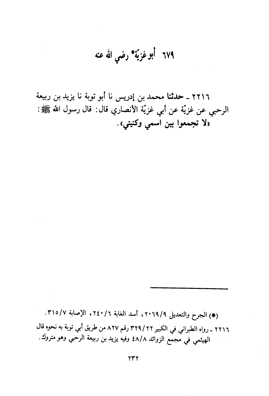 2216 - حَدَّثَنَا مُحَمَّدُ بْنُ إِدْرِيسَ، نا أَبُو تَوْبَةَ، نا يَزِيدُ بْنُ رَبِيعَةَ الرَّحَبِيُّ، عَنْ غَزِيَّةَ، عَنْ أَبِي غَزِيَّةَ الْأَنْصَارِيِّ، قَالَ: قَالَ رَسُولُ اللَّهِ صَلَّى اللهُ عَلَيْهِ وَسَلَّمَ: «§لَا تَجْمَعُوا بَيْنَ اسْمِي وَكُنْيَتِي»