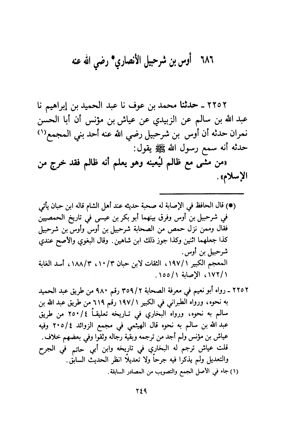 2252 - حَدَّثَنَا مُحَمَّدُ بْنُ عَوْفٍ، نا عَبْدُ الْحَمِيدِ بْنُ إِبْرَاهِيمَ، نا عَبْدُ اللَّهِ بْنُ سَالِمٍ، عَنِ الزُّبَيْدِيِّ، عَنْ عَيَّاشِ بْنِ مُؤْنِسٍ، أَنَّ أَبَا الْحَسَنِ نِمْرَانَ حَدَّثَهُ أَنَّ أَوْسَ بْنَ شُرَحْبِيلَ رَضِيَ اللَّهُ عَنْهُ أَحَدَ بَنِي الْمَجْمَعِ حَدَّثَهُ أَنَّهُ، سَمِعَ رَسُولَ اللَّهِ صَلَّى اللهُ عَلَيْهِ وَسَلَّمَ يَقُولُ: «§مَنْ مَشَى مَعَ ظَالِمٍ لِيُعِينَهُ وَهُوَ يَعْلَمُ أَنَّهُ ظَالِمٌ فَقَدْ خَرَجَ مِنَ الْإِسْلَامِ»