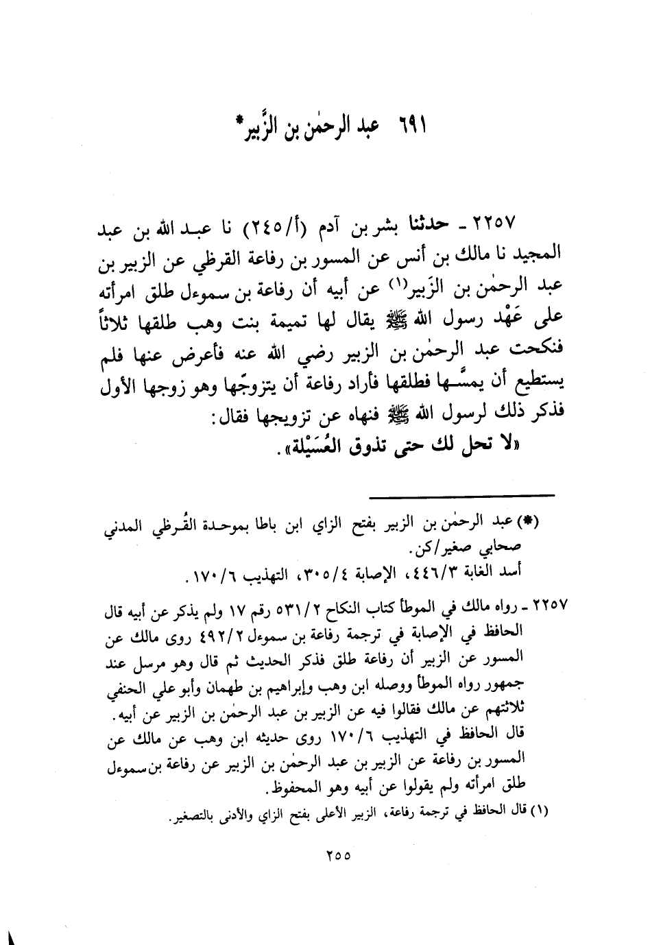 2257 - حَدَّثَنَا بِشْرُ بْنُ آدَمَ، نا عَبْدُ اللَّهِ بْنُ عَبْدِ الْمَجِيدِ، نا مَالِكُ بْنُ أَنَسٍ، عَنِ الْمِسْوَرِ بْنِ رِفَاعَةَ الْقُرَظِيِّ، عَنِ الزُّبَيْرِ بْنِ عَبْدِ الرَّحْمَنِ بْنِ الزُّبَيْرِ، عَنْ أَبِيهِ، أَنَّ رِفَاعَةَ بْنَ سَمَوْأَلٍ، طَلَّقَ امْرَأَتَهُ عَلَى عَهْدِ رَسُولِ اللَّهِ صَلَّى اللهُ عَلَيْهِ وَسَلَّمَ يُقَالُ لَهَا تَمِيمَةُ بِنْتُ وَهْبٍ طَلَّقَهَا ثَلَاثًا فَنَكَحَتْ عَبْدَ الرَّحْمَنِ بْنَ الزُّبَيْرِ رَضِيَ اللَّهُ عَنْهُ فَأَعْرَضَ عَنْهَا فَلَمْ يَسْتَطِيعَ أَنْ يَمَسَّهَا فَطَلَّقَهَا فَأَرَادَ رِفَاعَةُ أَنْ يَتَزَوَّجَهَا وَهُوَ زَوْجُهَا الْأَوَّلُ فَذَكَرَ ذَلِكَ لِرَسُولِ اللَّهِ صَلَّى اللهُ عَلَيْهِ وَسَلَّمَ فَنَهَاهُ عَنْ تَزْوِيجِهَا فَقَالَ: «§لَا تَحِلُّ لَكَ حَتَّى تَذُوقَ الْعُسَيْلَةَ»