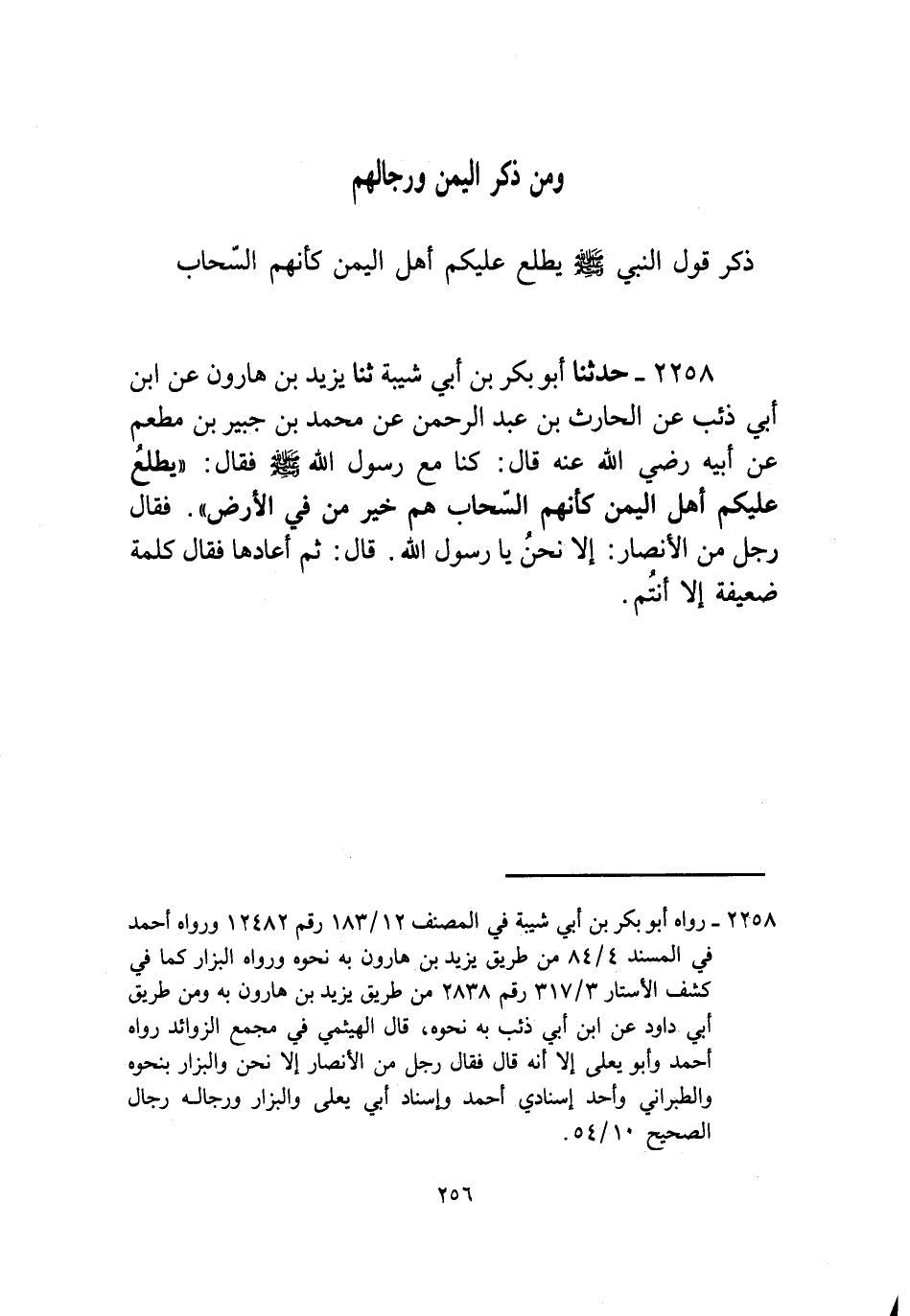 2258 - حَدَّثَنَا أَبُو بَكْرِ بْنُ أَبِي شَيْبَةَ، ثنا يَزِيدُ بْنُ هَارُونَ، عَنِ ابْنِ أَبِي ذِئْبٍ، عَنِ الْحَارِثِ بْنِ عَبْدِ الرَّحْمَنِ، عَنْ مُحَمَّدِ بْنِ جُبَيْرِ بْنِ مُطْعِمٍ، عَنْ أَبِيهِ، رَضِيَ اللَّهُ عَنْهُ قَالَ: كُنَّا مَعَ رَسُولِ اللَّهِ صَلَّى اللهُ عَلَيْهِ وَسَلَّمَ فَقَالَ: «§يَطْلُعُ عَلَيْكُمْ أَهْلُ الْيَمَنِ كَأَنَّهُمُ السَّحَابُ هُمْ خَيْرُ مَنْ فِي الْأَرْضِ» فَقَالَ رَجُلٌ مِنَ الْأَنْصَارِ: إِلَّا نَحْنُ يَا رَسُولَ اللَّهِ قَالَ: ثُمَّ أَعَادَهَا فَقَالَ كَلِمَةً ضَعِيفَةً: «إِلَّا أَنْتُمْ»