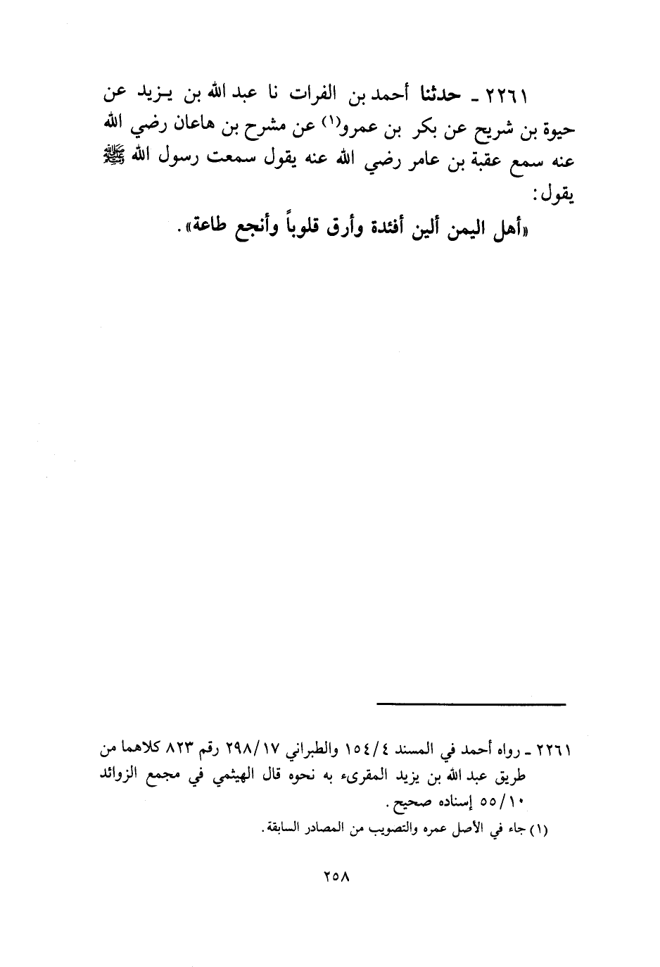 2261 - حَدَّثَنَا أَحْمَدُ بْنُ الْفُرَاتِ، نا عَبْدُ اللَّهِ بْنُ يَزِيدَ، عَنْ حَيْوَةَ بْنِ شُرَيْحٍ، عَنْ بَكْرِ بْنِ عَمْرٍو، عَنْ مِشْرَحِ بْنِ هَاعَانَ، رَضِيَ اللَّهُ عَنْهُ سَمِعَ عُقْبَةَ بْنَ عَامِرٍ، رَضِيَ اللَّهُ عَنْهُ يَقُولُ: سَمِعْتُ رَسُولَ اللَّهِ صَلَّى اللهُ عَلَيْهِ وَسَلَّمَ يَقُولُ: «§أَهْلُ الْيَمَنِ أَلْيَنُ أَفْئِدَةً، وَأَرَقُّ قُلُوبًا، وَأَنْجَعُ طَاعَةً»