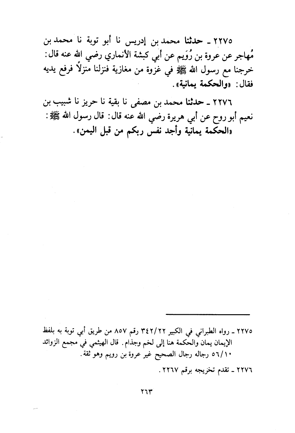 2275 - حَدَّثَنَا مُحَمَّدُ بْنُ إِدْرِيسَ، نا أَبُو تَوْبَةَ، نا مُحَمَّدُ بْنُ مُهَاجِرٍ، عَنْ عُرْوَةَ بْنِ رُوَيْمٍ، عَنْ أَبِي كَبْشَةَ الْأَنْمَارِيِّ، رَضِيَ اللَّهُ عَنْهُ قَالَ: خَرَجْنَا مَعَ رَسُولِ اللَّهِ صَلَّى اللهُ عَلَيْهِ وَسَلَّمَ فِي غَزْوَةٍ مِنْ مَغَازِيهِ فَنَزَلْنَا مَنْزِلًا فَرَفَعَ يَدَيْهِ فَقَالَ: «§وَالْحِكْمَةُ يَمَانِيَّةٌ»
