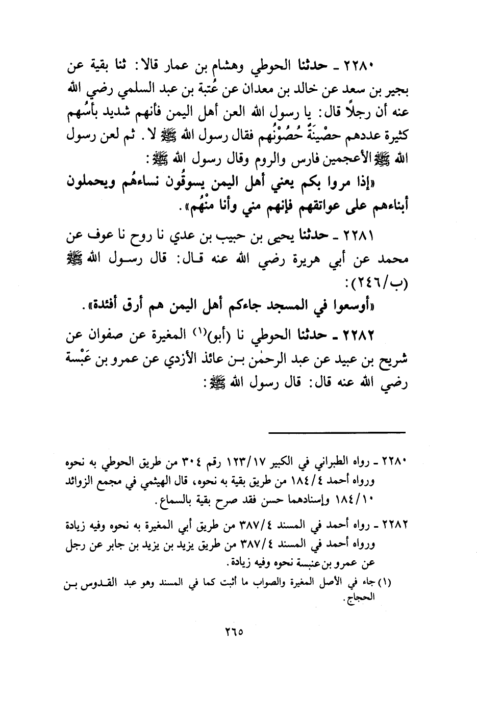 2280 - حَدَّثَنَا الْحَوْطِيُّ، وَهِشَامُ بْنُ عَمَّارٍ، قَالَا: ثنا بَقِيَّةُ، عَنْ بُحَيْرِ بْنِ سَعْدٍ، عَنْ خَالِدِ بْنِ مَعْدَانَ، عَنْ عُتْبَةَ بْنِ عَبْدِ السَّلَمِيِّ، رَضِيَ اللَّهُ عَنْهُ أَنَّ رَجُلًا قَالَ: يَا رَسُولَ اللَّهِ الْعَنْ أَهْلَ الْيَمَنِ فَإِنَّهُمْ شَدِيدٌ بَأْسُهُمْ كَثِيرَةٌ عَدَدُهُمْ حَصِينَةٌ حُصُونُهُمْ فَقَالَ رَسُولُ اللَّهِ صَلَّى اللهُ عَلَيْهِ وَسَلَّمَ: «لَا» ثُمَّ §لَعَنَ رَسُولُ اللَّهِ صَلَّى اللهُ عَلَيْهِ وَسَلَّمَ الْأَعْجَمَيْنِ فَارِسَ وَالرُّومَ وَقَالَ رَسُولُ اللَّهِ صَلَّى اللهُ عَلَيْهِ وَسَلَّمَ: «إِذَا مَرُّوا بِكُمْ يَعْنِي أَهْلَ الْيَمَنِ يَسُوقُونَ نِسَاءَهُمْ وَيَحْمِلُونَ أَبْنَاءَهُمْ عَلَى عَوَاتِقِهِمْ فَإِنَّهُمْ مِنِّي وَأَنَا مِنْهُمْ»