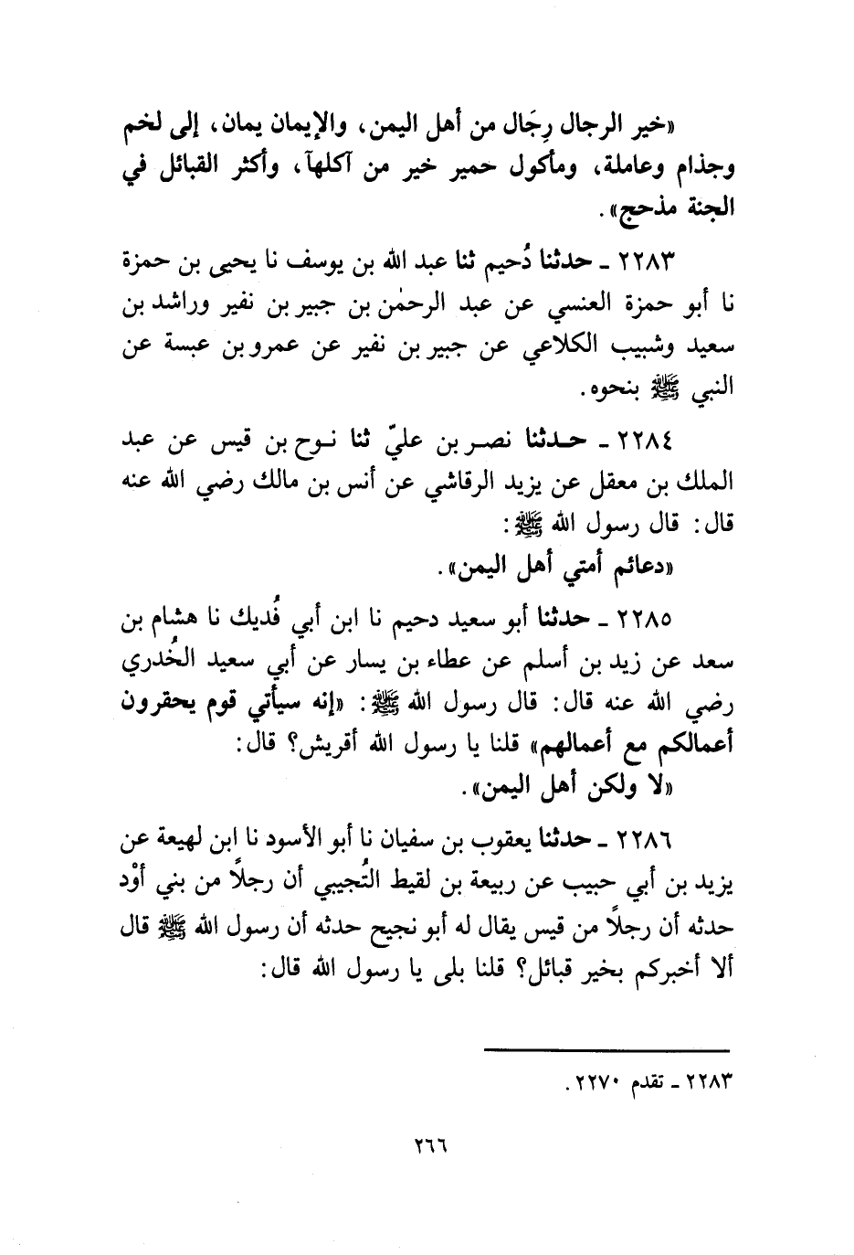 2285 - حَدَّثَنَا أَبُو سَعِيدٍ دُحَيْمٌ، نا ابْنُ أَبِي فُدَيْكٍ، نا هِشَامُ بْنُ سَعْدٍ، عَنْ زَيْدِ بْنِ أَسْلَمَ، عَنْ عَطَاءِ بْنِ يَسَارٍ، عَنْ أَبِي سَعِيدٍ الْخُدْرِيِّ، رَضِيَ اللَّهُ عَنْهُ قَالَ: قَالَ رَسُولُ اللَّهِ صَلَّى اللهُ عَلَيْهِ وَسَلَّمَ: «§إِنَّهُ سَيَأْتِي قَوْمٌ يَحْقِرُونَ أَعْمَالَكُمْ مَعَ أَعْمَالِهِمْ» قُلْنَا: يَا رَسُولَ اللَّهِ أَقُرَيْشٌ؟ قَالَ: «لَا وَلَكِنْ أَهْلُ الْيَمَنِ»