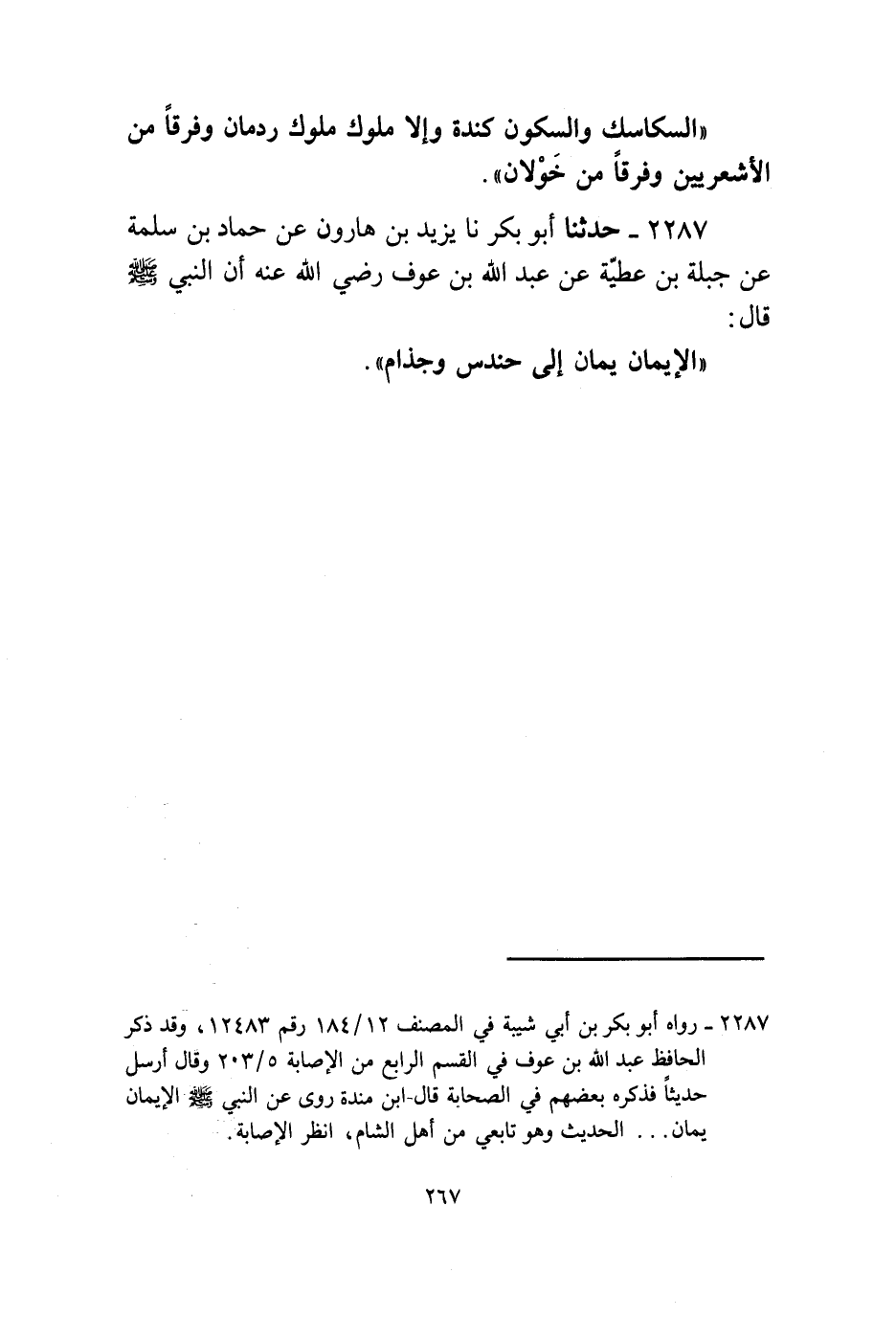 2287 - حَدَّثَنَا أَبُو بَكْرٍ، نا يَزِيدُ بْنُ هَارُونَ، عَنْ حَمَّادِ بْنِ سَلَمَةَ، عَنْ جَبَلَةَ بْنِ عَطِيَّةَ، عَنْ عَبْدِ اللَّهِ بْنِ عَوْفٍ، رَضِيَ اللَّهُ عَنْهُ أَنَّ النَّبِيَّ صَلَّى اللهُ عَلَيْهِ وَسَلَّمَ قَالَ: «§الْإِيمَانُ يَمَانٍ إِلَى حِنْدِسٍ وَجُذَامَ»