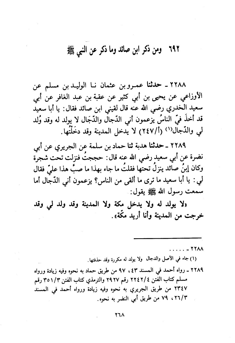 2289 - حَدَّثَنَا عَمْرُو بْنُ عُثْمَانَ، نا الْوَلِيدُ بْنُ مُسْلِمٍ، عَنِ الْأَوْزَاعِيِّ، عَنْ يَحْيَى بْنِ أَبِي كَثِيرٍ، عَنْ عُقْبَةَ بْنِ عَبْدِ الْغَافِرِ، عَنْ أَبِي سَعِيدٍ الْخُدْرِيِّ، رَضِيَ اللَّهُ عَنْهُ قَالَ: §لَقِيَنِي ابْنُ صَائِدٍ فَقَالَ: يَا أَبَا سَعِيدٍ قَدْ أَخَذَ فِيَّ النَّاسُ يَزْعُمُونَ أَنِّي الدَّجَّالُ، وَالدَّجَّالُ لَا يُولَدُ لَهُ وَقَدْ وُلِدَ لِي، وَالدَّجَّالُ لَا يَدْخُلُ الْمَدِينَةَ وَقَدْ دَخَلْتُهَا "