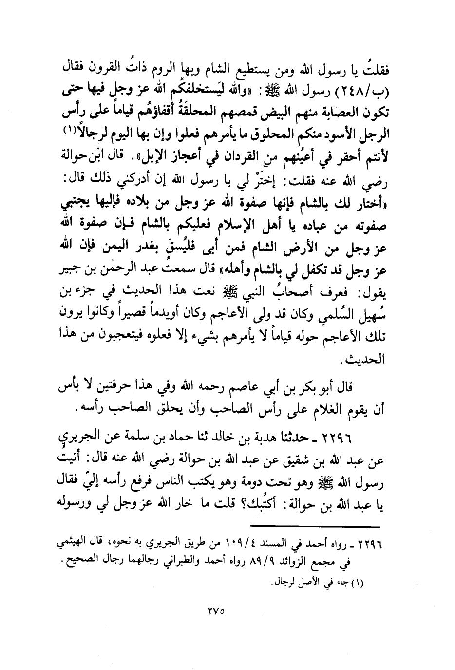 2296 - حَدَّثَنَا هُدْبَةُ بْنُ خَالِدٍ، ثنا حَمَّادُ بْنُ سَلَمَةَ، عَنِ الْجُرَيْرِيِّ، عَنْ عَبْدِ اللَّهِ بْنِ شَقِيقٍ، عَنْ عَبْدِ اللَّهِ بْنِ حَوَالَةَ، رَضِيَ اللَّهُ عَنْهُ قَالَ: أَتَيْتُ رَسُولَ اللَّهِ صَلَّى اللهُ عَلَيْهِ وَسَلَّمَ وَهُوَ تَحْتَ دَوْمَةٍ وَهُوَ يَكْتُبُ النَّاسَ فَرَفَعَ رَأْسَهُ إِلَيَّ فَقَالَ: «§يَا عَبْدَ اللَّهِ بْنَ حَوَالَةَ أَكْتُبُكَ؟» قُلْتُ: مَا خَارَ اللَّهُ عَزَّ وَجَلَّ لِي وَرَسُولُهُ -[276]- قَالَ: فَرَأَيْتُ فِي الْكِتَابِ أَبَا بَكْرٍ وَعُمَرَ فَقُلْتُ: إِنَّهُمَا لَا يَكْتُبَانِ إِلَّا فِي خَيْرٍ فَقُلْتُ: نَعَمْ فَكَتَبَنِي فَقَالَ: يَا عَبْدَ اللَّهِ بْنَ حَوَالَةَ كَيْفَ تَصْنَعُ فِي فِتْنَةٍ تَكُونُ فِي أَقْطَارِ الْأَرْضِ كَأَنَّهَا صَيَاصِي الْبَقَرِ وَالَّتِي بَعْدَهَا فِيهَا كَنَفْخَةِ أَرْنَبٍ فَقُلْتُ: مَا خَارَ اللَّهُ عَزَّ وَجَلَّ لِي وَرَسُولُهُ عَلَيْهِ السَّلَامُ قَالَ: اتْبَعْ هَذَا فَإِنَّهُ يَوْمَئِذٍ وَمَنْ مَعَهُ عَلَى الْحَقِّ قَالَ: فَلَحِقْتُ الرَّجُلَ فَأَخَذْتُ بِمَنْكِبَيْهِ فَلَفَتُّهُ فَقُلْتُ: يَا رَسُولَ اللَّهِ هَذَا؟ قَالَ: «نَعَمْ» فَإِذَا عُثْمَانُ بْنُ عَفَّانَ رَضِيَ اللَّهُ عَنْهُ وَقَالَ رَسُولُ اللَّهِ صَلَّى اللهُ عَلَيْهِ وَسَلَّمَ: «ذَاتَ يَوْمٍ يَهْجِمُونَ عَلَى رَجُلٍ مُعْتَجِرٍ يُبَايِعُ النَّاسَ مِنْ أَهْلِ الْجَنَّةِ» فَهَجَمْنَا عَلَى عُثْمَانَ رَضِيَ اللَّهُ عَنْهُ وَهُوَ يُبَايِعُ النَّاسَ